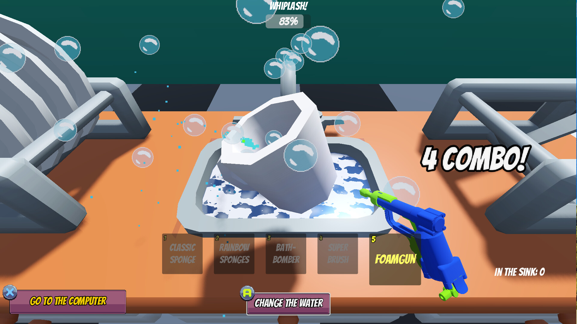 Using the Super Sink 3000, teleport your clients’ dirty dishes straight into your sink and complete a wide variety of absurd yet satisfying contracts.