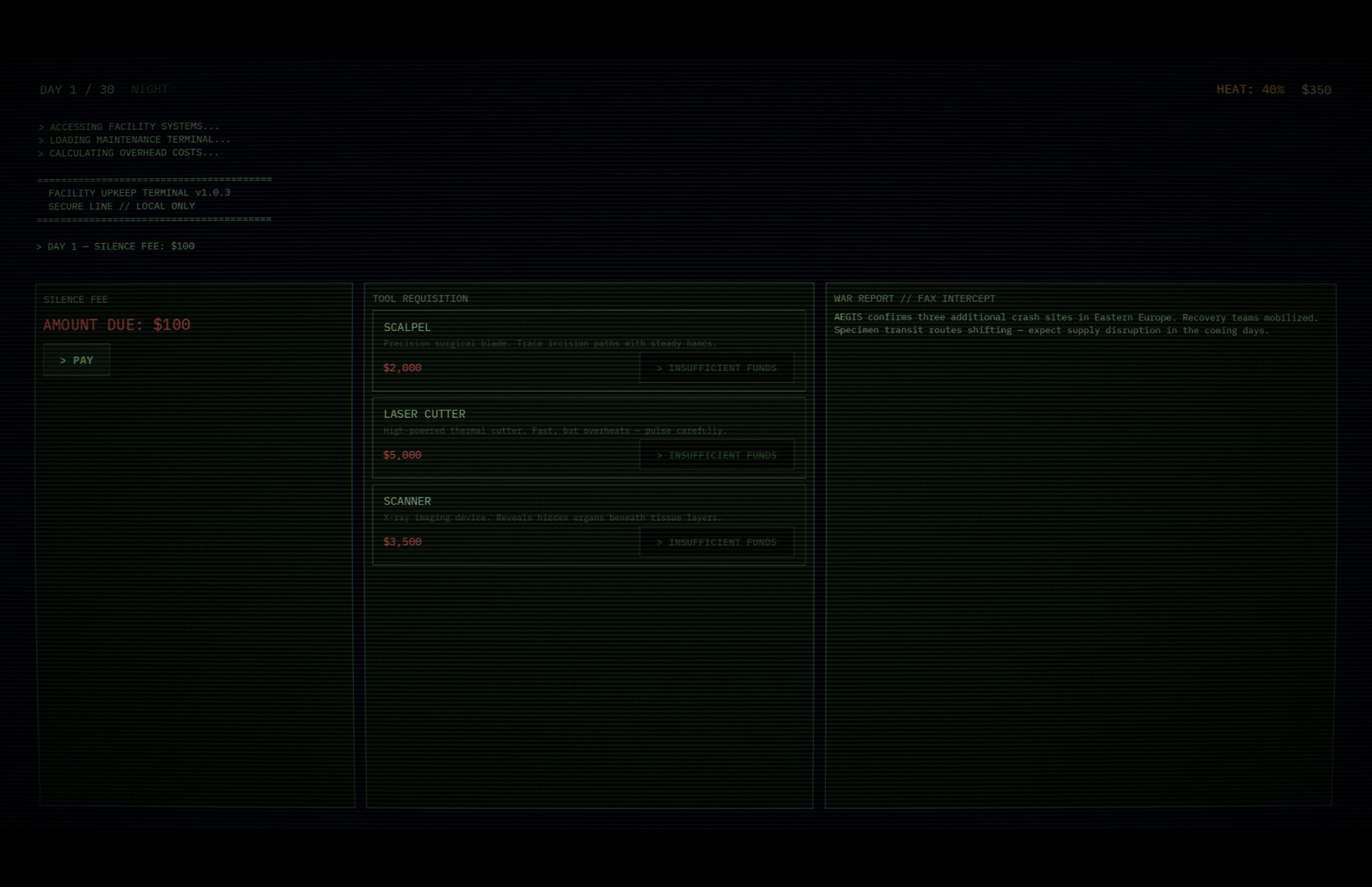 Buy alien remains off the black market. Cut them open on your basement autopsy table. Sell the organs to the highest bidder before the feds find you. A body-horror management sim set in Gary, Indiana 1993.