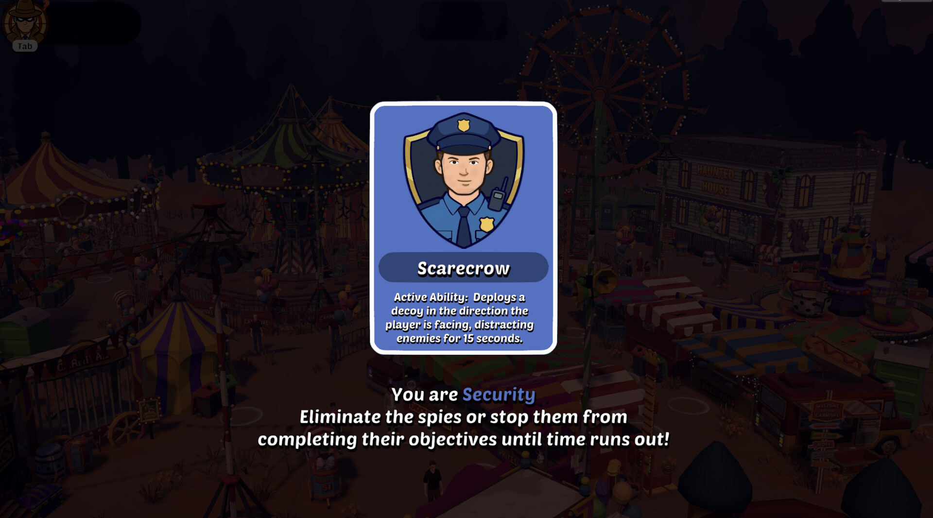 Spy Carnival is a 2-8 player social deduction game set in a vibrant, chaotic funfair. Spies hide among the crowd, sabotaging rides and eliminating visitors while blending in with the NPCs. Officers must stay sharp, read the crowd and take down the spies before the carnival turns into complete chaos.