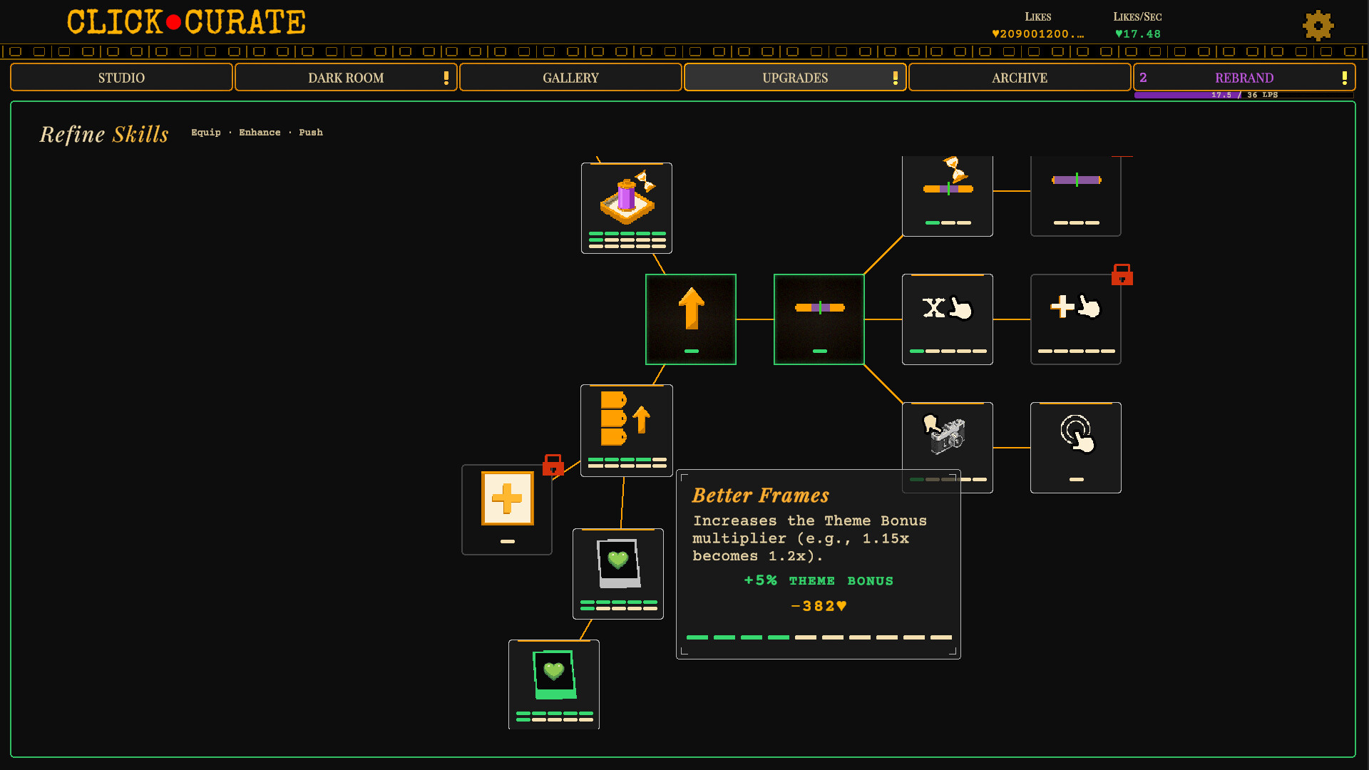 Hit an Likes per second threshold or find a Legendary photos to earn Influence Points. Spend them on permanent upgrades that survive every reset. Each run starts from a higher floor.