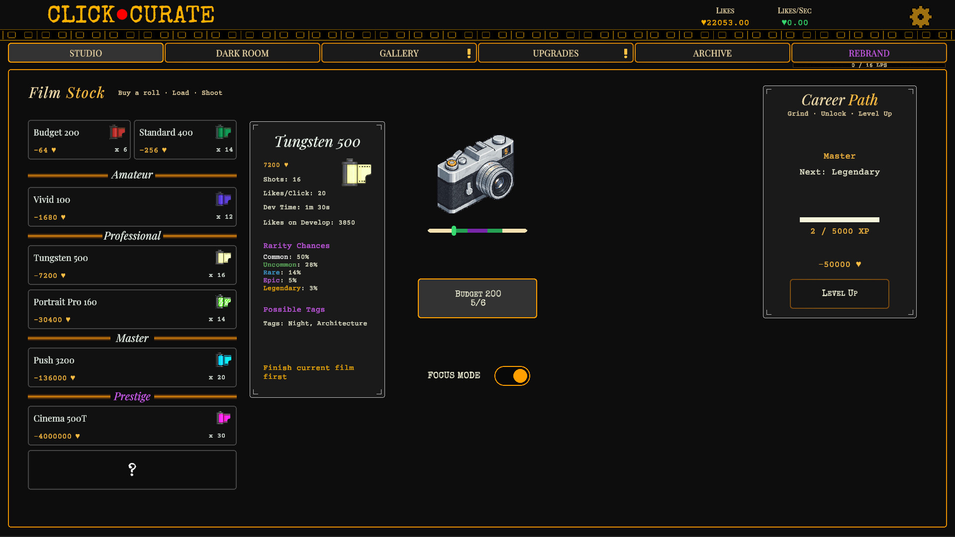 Eight Films. Infinite Possibilities. Select your film stock to define your strategy. From reliable "Budget" rolls to high-stakes "Rare" stocks, every choice shifts your rarity odds and tag bonuses. Will you play it safe or chase the perfect high-risk shot?