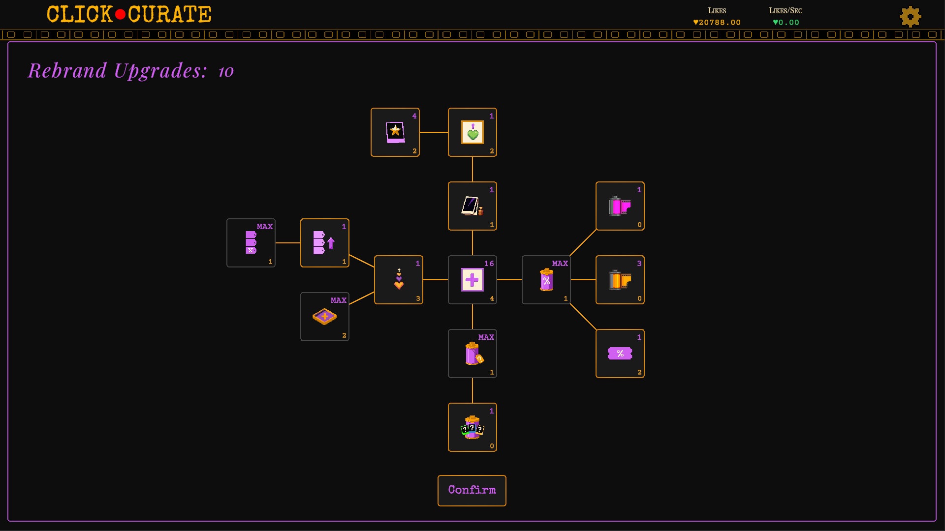 Hit an Likes per second threshold or find a Legendary photos to earn Influence Points. Spend them on permanent upgrades that survive every reset. Each run starts from a higher floor.