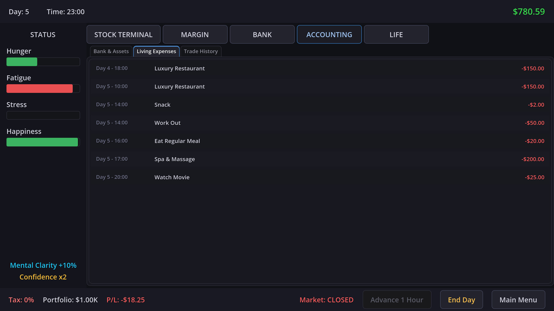 Trading isn't just about reading charts; it's about staying alive. You must carefully manage your 4 core lifelines: Hunger, Fatigue, Stress, and Happiness. Miss a meal to afford a stock? Your health deteriorates. Lose a trade? Your stress levels spike. Balance your biological needs with your financial ambitions before your body goes bankrupt.