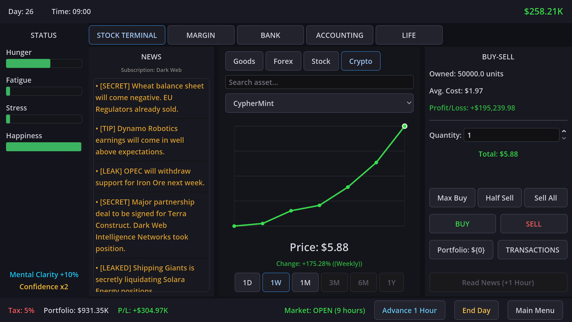 Le trading ne se limite pas à lire des graphiques ; il s'agit de rester en vie. Vous devez gérer avec soin vos 4 ressources vitales : la Faim, la Fatigue, le Stress et le Bonheur. Vous sautez un repas pour acheter une action ? Votre santé se détériore. Vous perdez une transaction ? Votre niveau de stress monte en flèche. Équilibrez vos besoins biologiques avec vos ambitions financières avant que votre corps ne fasse faillite.
