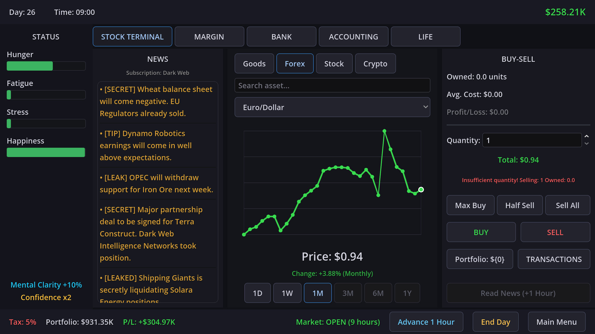 Operar en la bolsa no se trata solo de leer gráficos; se trata de mantenerse con vida. Debes gestionar cuidadosamente tus 4 sustentos vitales: Hambre, Fatiga, Estrés y Felicidad. ¿Saltarse una comida para poder comprar una acción? Tu salud se deteriora. ¿Pierdes en una operación? Tus niveles de estrés se disparan. Equilibra tus necesidades biológicas con tus ambiciones financieras antes de que tu cuerpo se declare en quiebra.