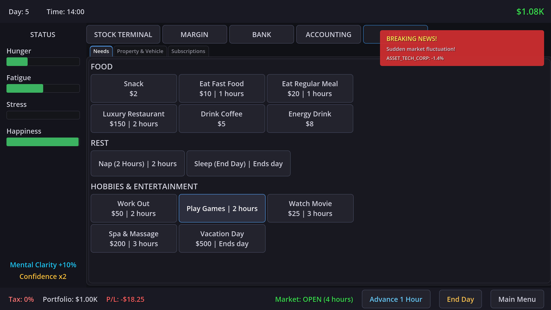 Trading isn't just about reading charts; it's about staying alive. You must carefully manage your 4 core lifelines: Hunger, Fatigue, Stress, and Happiness. Miss a meal to afford a stock? Your health deteriorates. Lose a trade? Your stress levels spike. Balance your biological needs with your financial ambitions before your body goes bankrupt.
