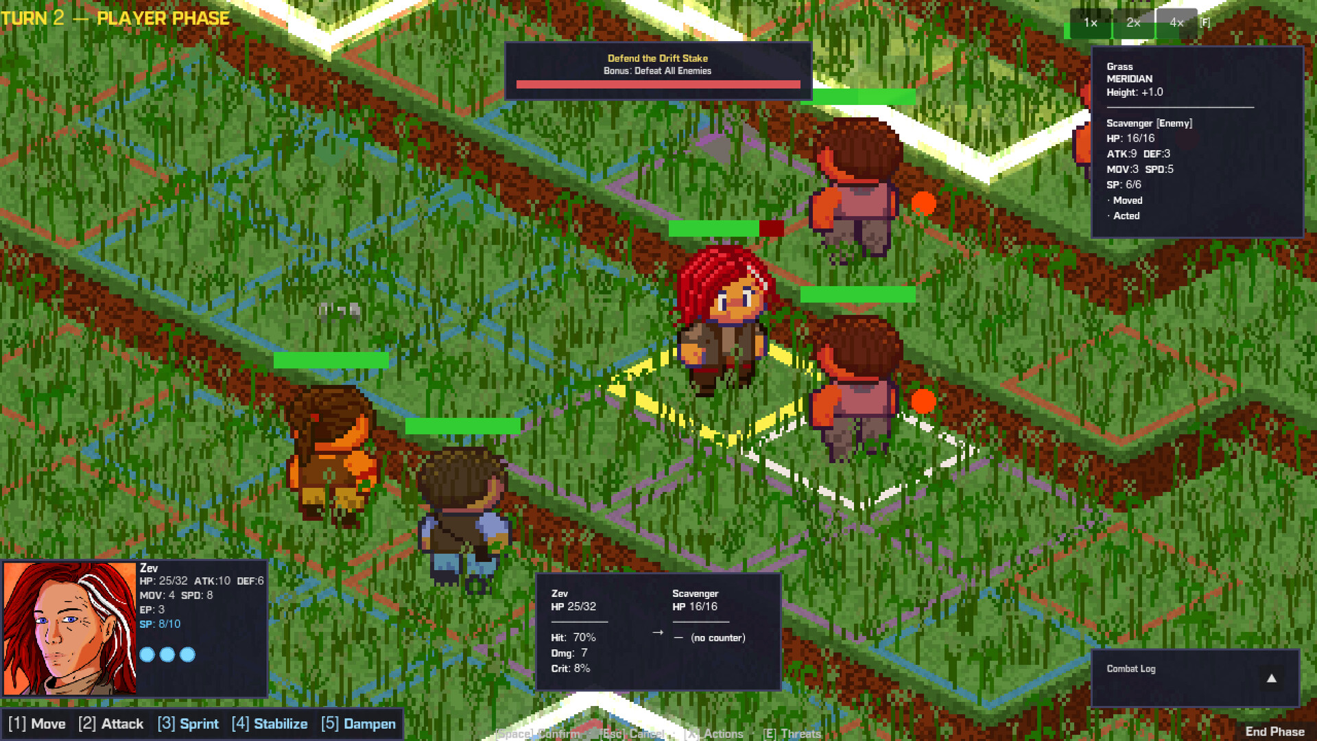 A turn-based tactical RPG where time is terrain. Place each character on the ground they fight best on, then use your frontier anchor to stabilize the field when the gradient turns against you. Every step costs time.