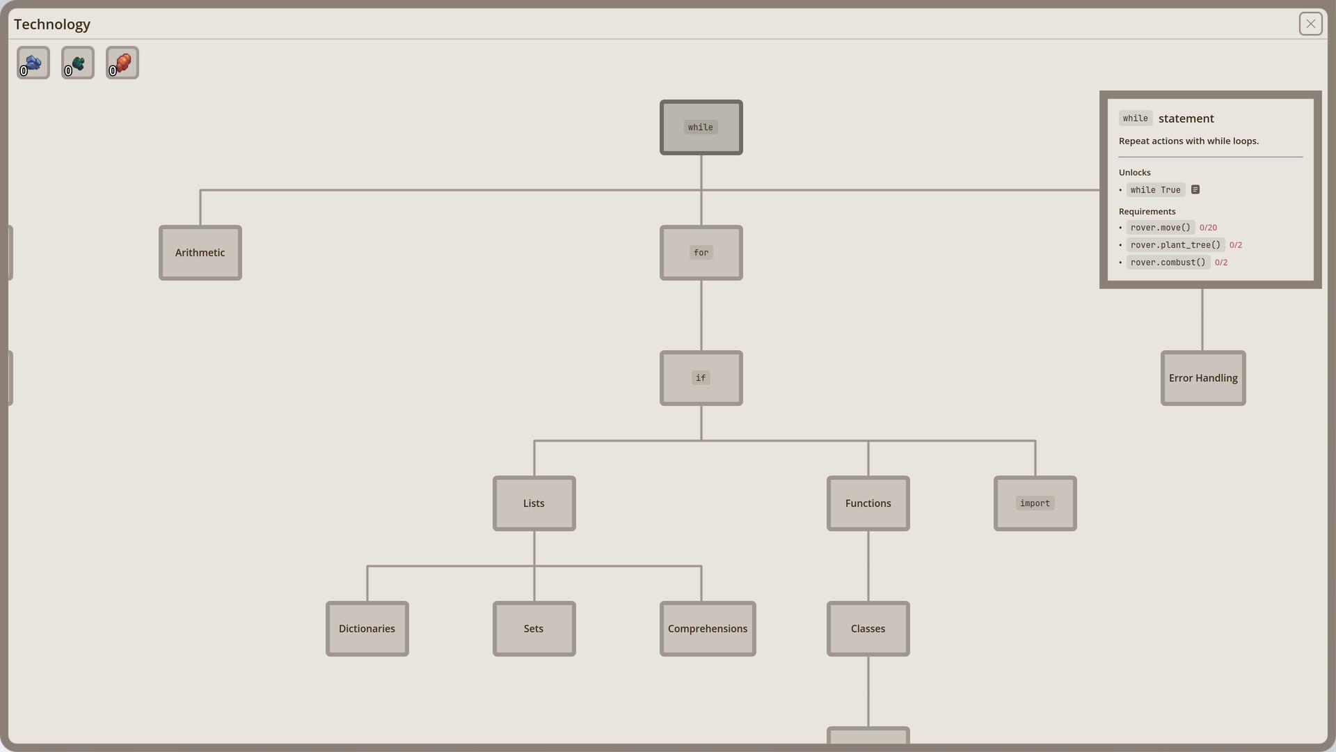 The game introduces programming concepts one at a time, so no experience is needed. Write a line of code, watch your robot do it — that's how you learn. Each new technology unlocks new language features, letting you automate tasks you once had to do by hand. Already a programmer? Dive straight in or use it to practice your Python skills.