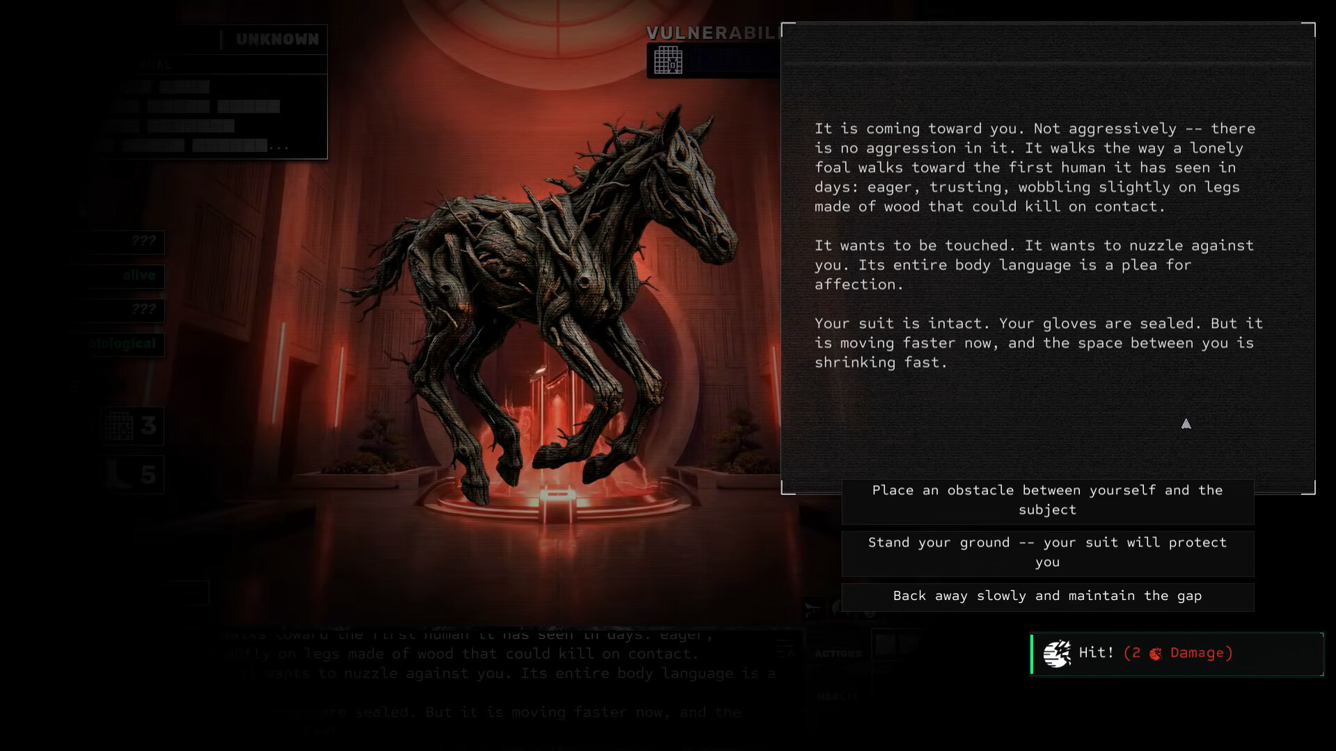 Study a creature to reveal hidden traits. Talk to it through branching dialogue that can expose weaknesses or make things worse. Contain it, destroy it, or flee. Every path is viable. None of them are safe.