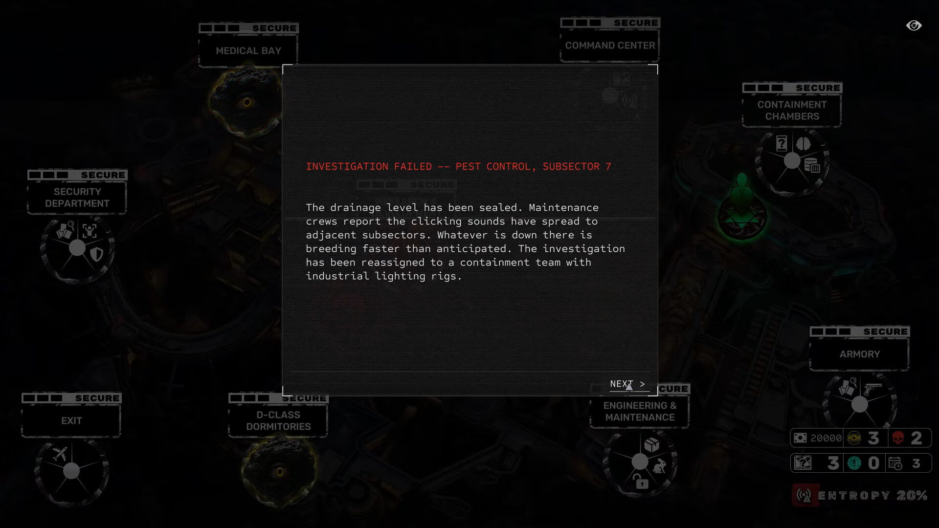 Entropy: Quiet at first. Until it isn't. Lockdowns seal off entire wings. Failures cascade from one system to the next. At 100%, the scenario's final threat arrives. It doesn't care how prepared you are.