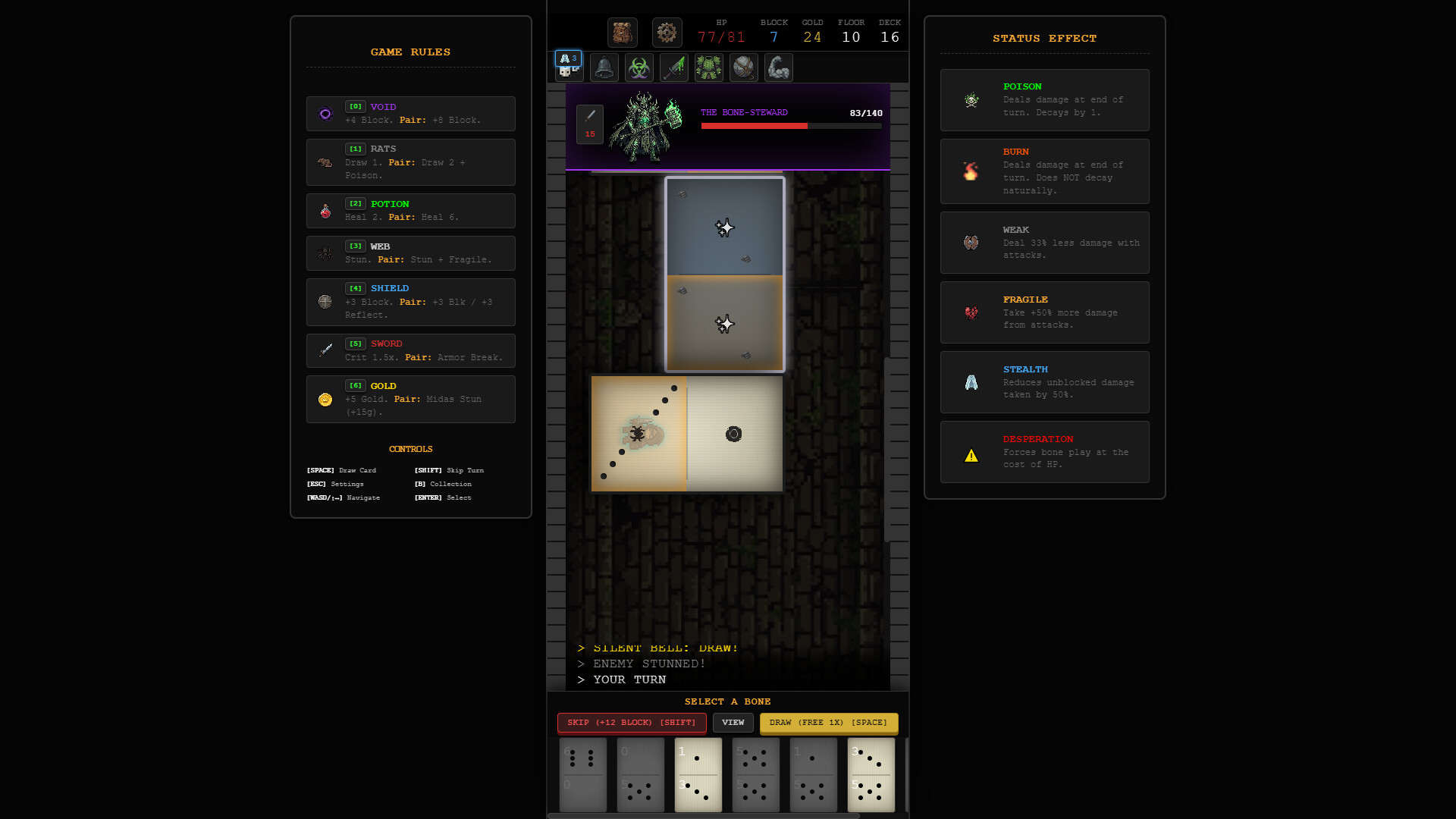 • Play it Desperate: Run out of valid moves? Your bones will glow red. You can force a piece onto the board with a "Desperation Play," but it’s going to cost you your own HP.