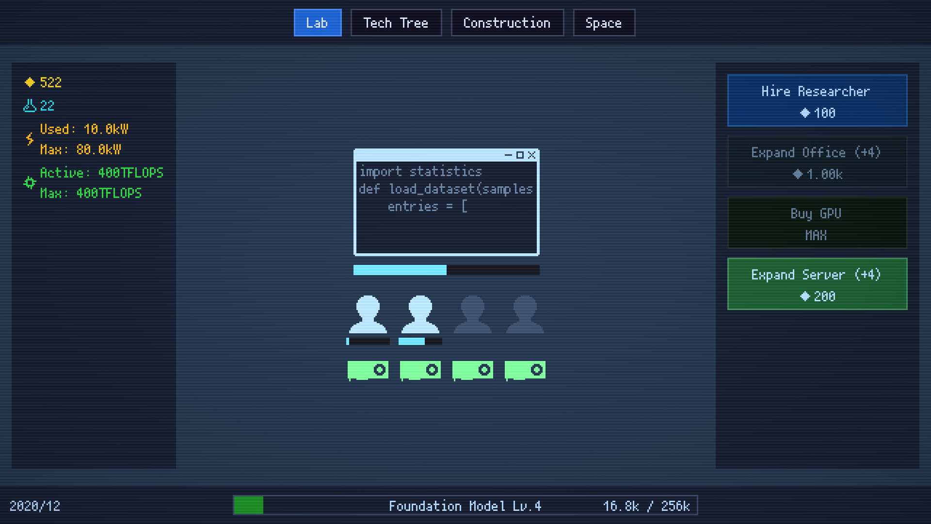 A clicker/incremental game themed around AGI (Artificial General Intelligence) development. Use AI to streamline AI development, build data centers and power plants, and venture into space in pursuit of even more power.
