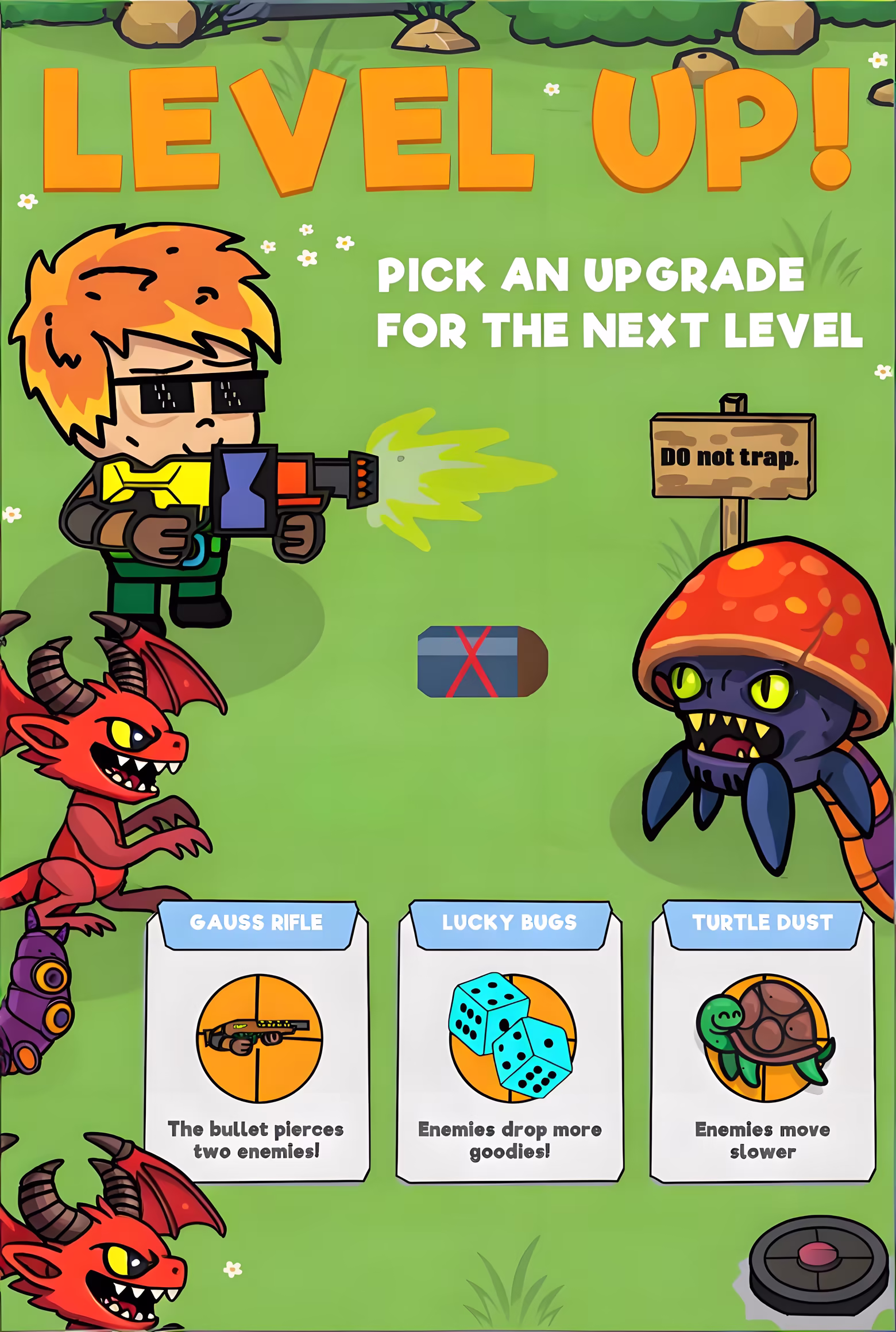 This is a simple shooting defense game. Players wield guns to fight in a fixed scene, repelling monsters attacking from above and below. Defeating enemies grants shields and various bullets, using items to strengthen oneself, preventing monsters from crossing the defense line and approaching the treasure chest behind you, and holding the position to complete the defense. Each level also features various weapons like double shots, triple shots, energy shields, melee knives, mines, homing rockets. Hint: The character can also collide with monsters, but it costs health.