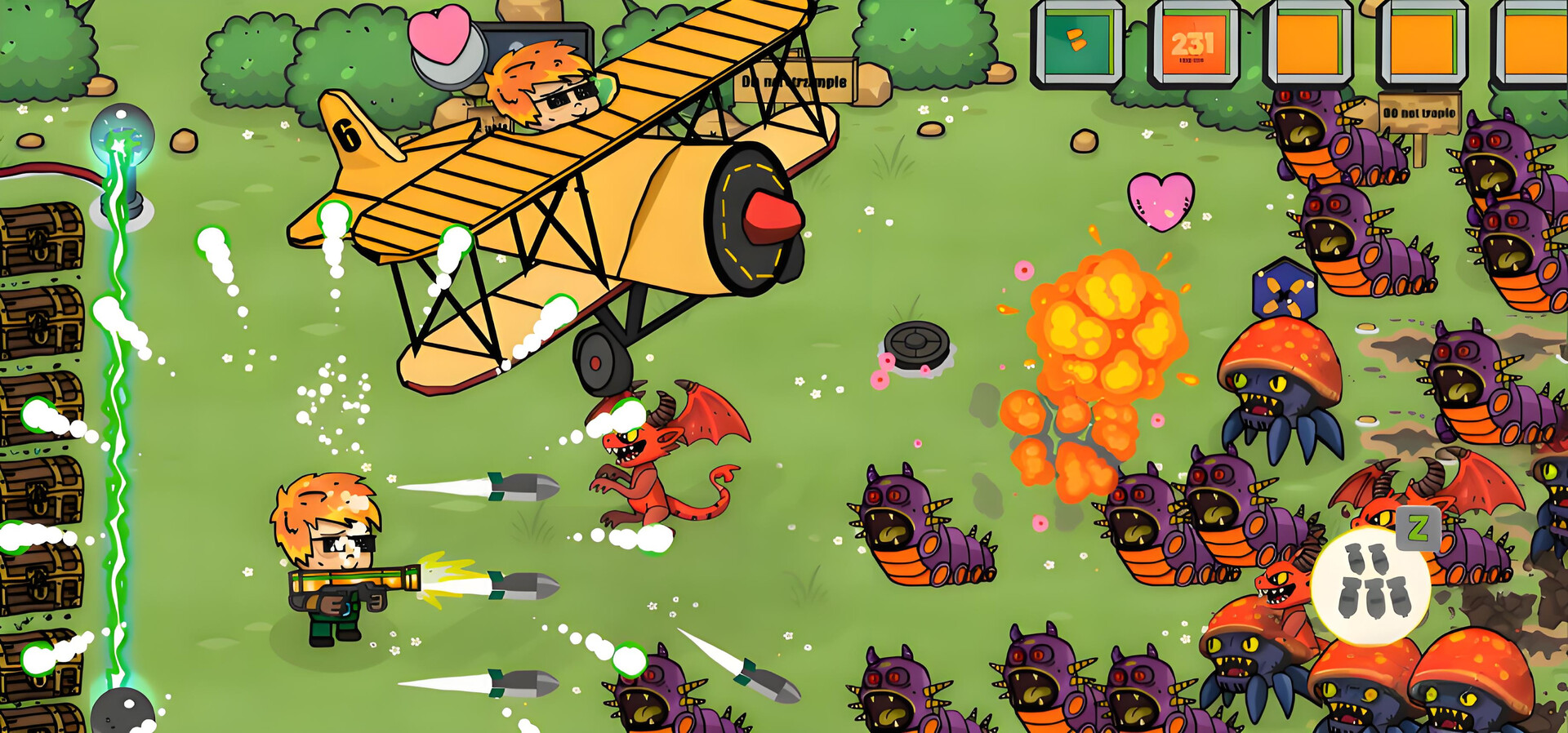 This is a simple shooting defense game. Players wield guns to fight in a fixed scene, repelling monsters attacking from above and below. Defeating enemies grants shields and various bullets, using items to strengthen oneself, preventing monsters from crossing the defense line and approaching the treasure chest behind you, and holding the position to complete the defense. Each level also features various weapons like double shots, triple shots, energy shields, melee knives, mines, homing rockets. Hint: The character can also collide with monsters, but it costs health.