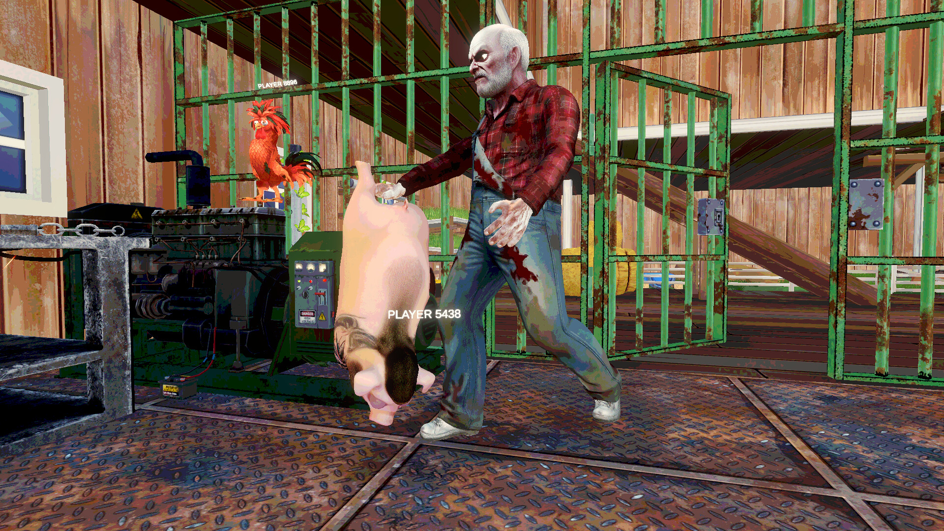 The game contains cartoonish, non-realistic violence and dark humor. Players control animals trying to escape a farmer and can get caught in various comical but deadly traps (such as a BBQ spit, a circular saw table, an electric puddle, or a meat hook). Characters can also be temporarily set on fire or caught in bear traps.