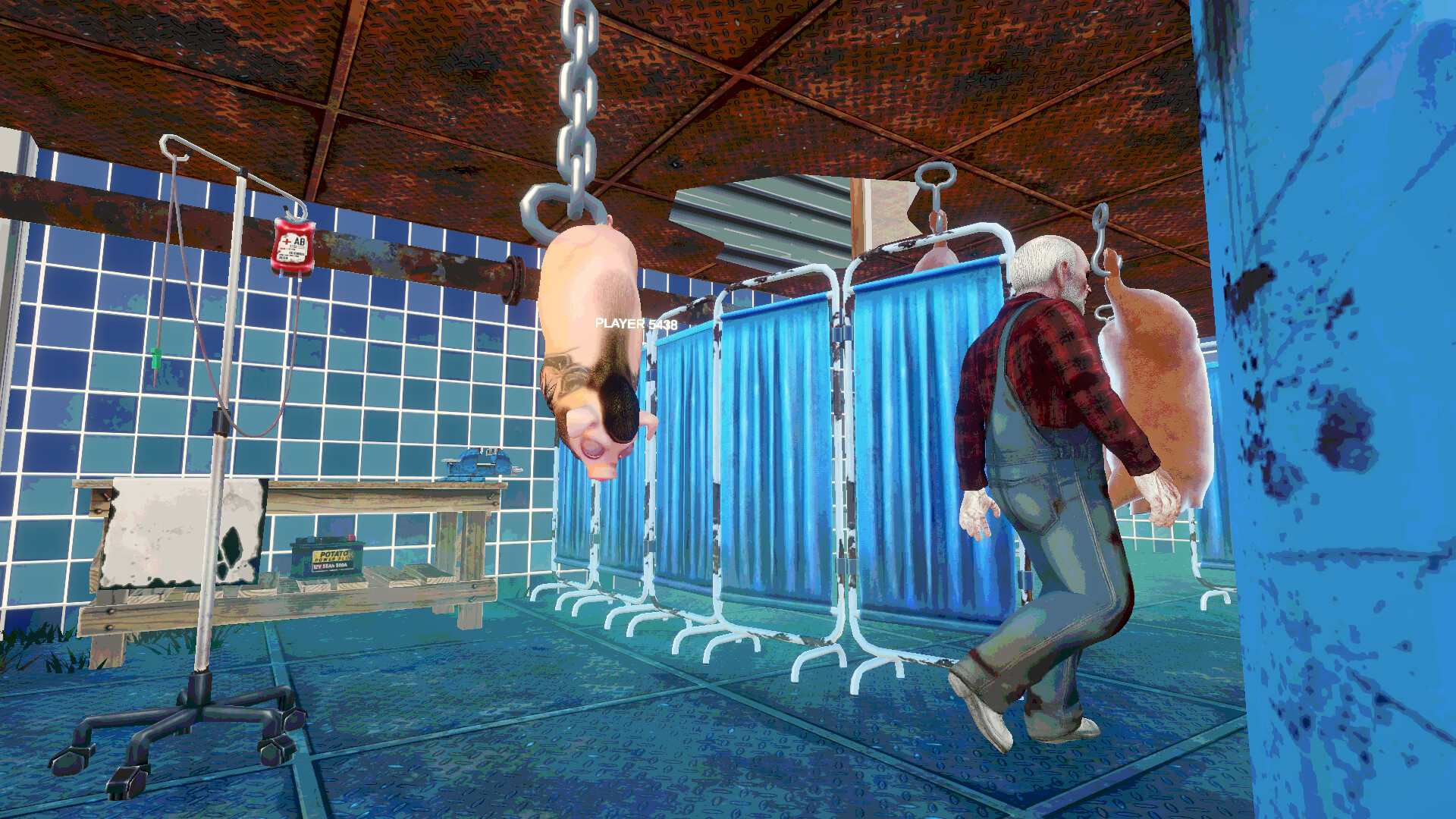 If the hunter does catch up to you, the game isn't over. The farmer grabs the poor soul by the legs and carries them to one of the prep stations: a BBQ spit, a circular saw, or a meat hook in the freezer. Your teammates have exactly 20 seconds to come to the rescue and save you. Didn't make it? Your buddy turns into a pack of sausages forever!