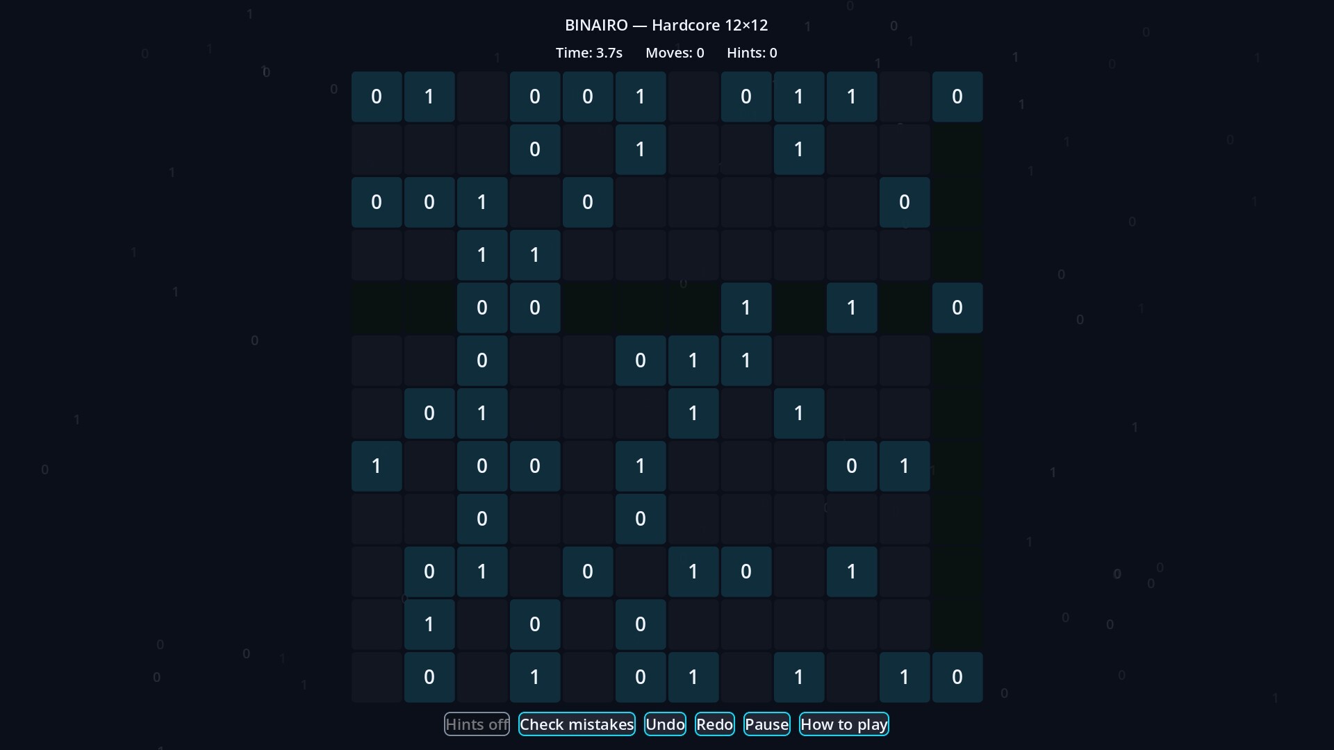 Challenge your logic with this beautiful and addictive binary puzzle game. Fill the grid with 0s and 1s while obeying three simple rules: no more than two identical numbers in a row or column, exactly the same number of 0s and 1s in every row and column, and no duplicate rows or columns. Every puzzle has a unique solution.