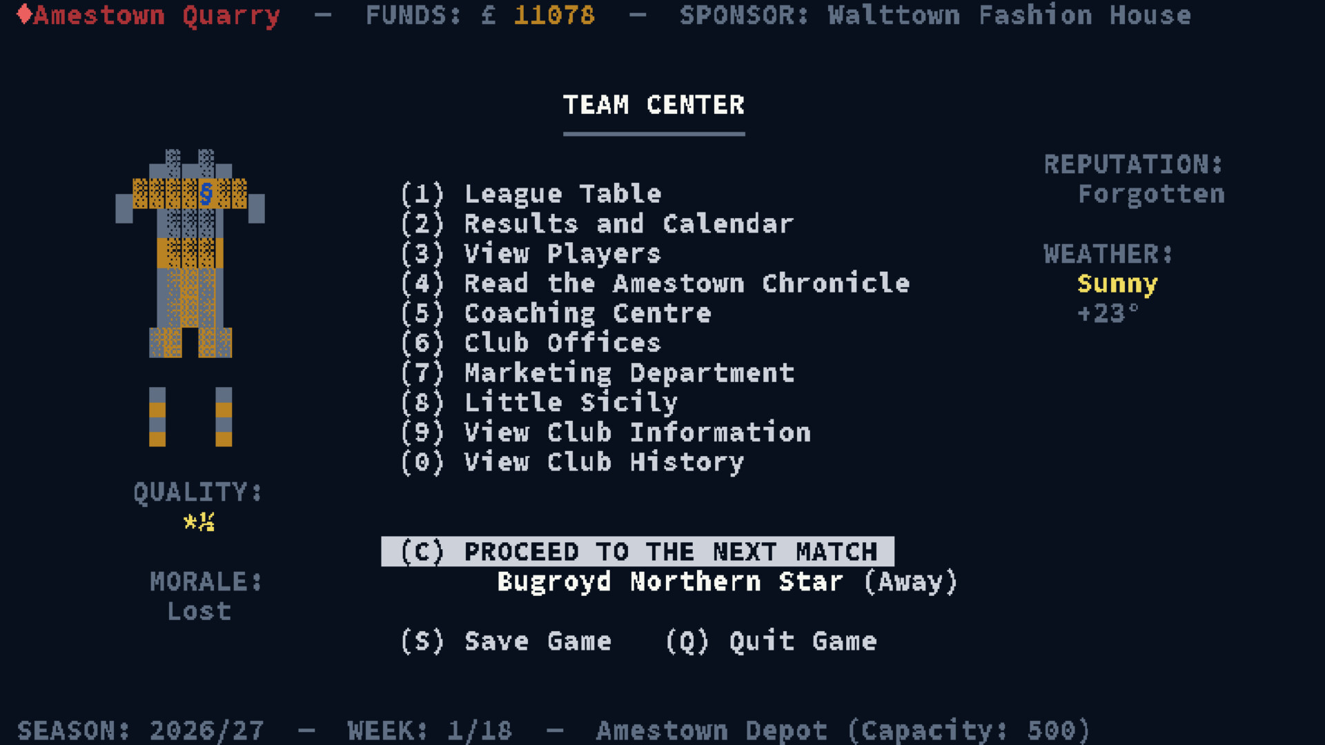 A text-based football management game with procedural storytelling, derby drama, and underworld influence. Build your club, shape your manager, and decide how far you’re willing to go to win.