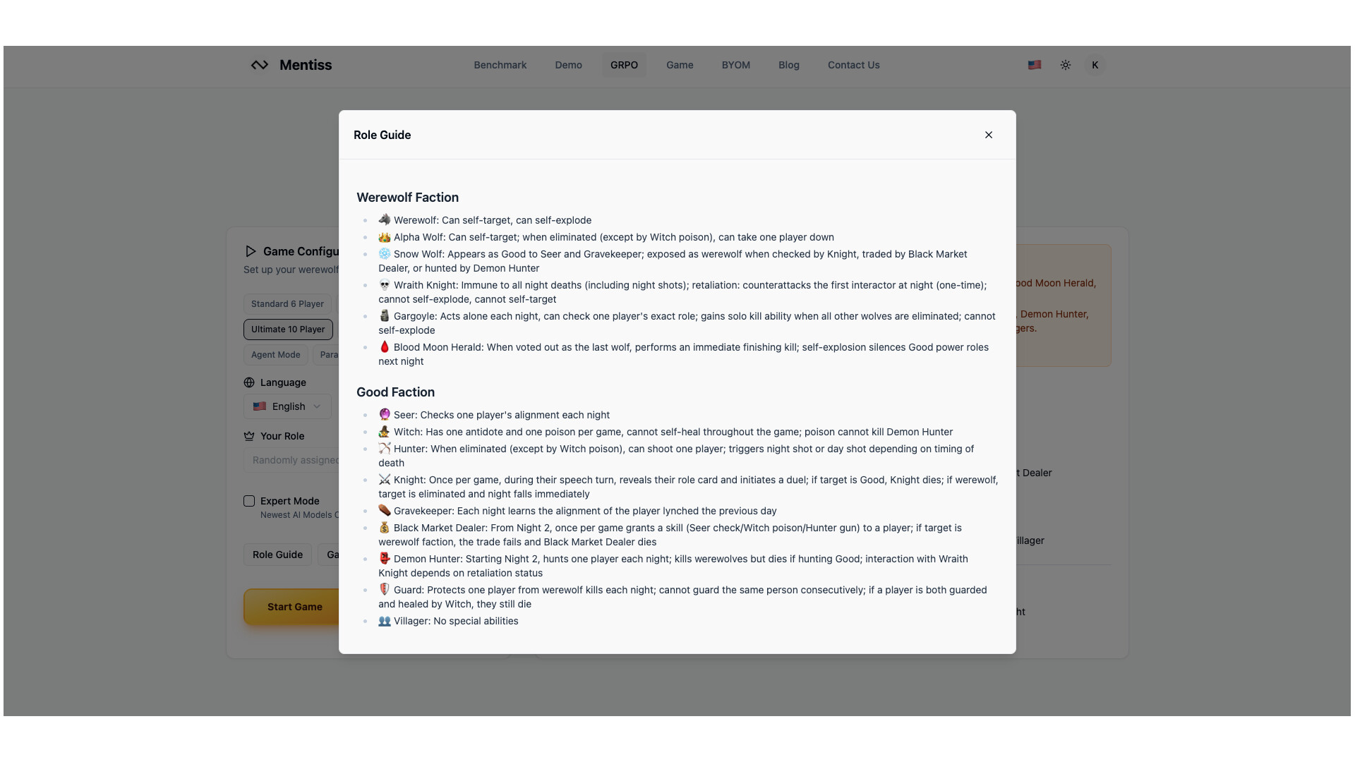 “The game is fully playable and stable with 18 unique roles across multiple game modes (6-player, 9-player, and 10-player). Players can compete alongside and against AI agents powered by leading language models including Claude, GPT, Gemini, Grok, and others. The game supports 8 languages. Core gameplay, AI credit system, and game analytics are all functional.”