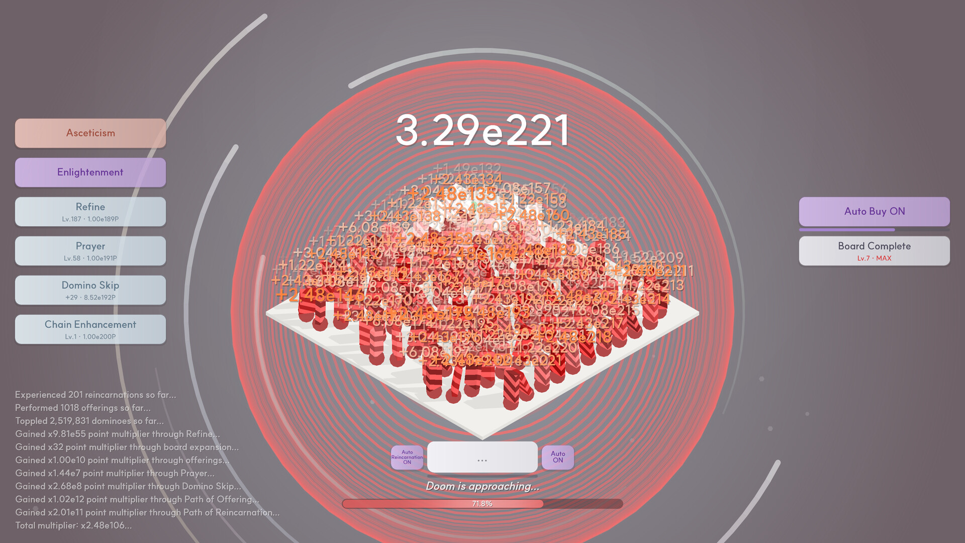 Doom has arrived. But beyond the end… there are still dominoes. Push the dominoes to start a chain reaction, and grow exponentially through offerings and reincarnation. A meditative idle game featuring multi-layered prestige, automation, and strategy-driven challenges.