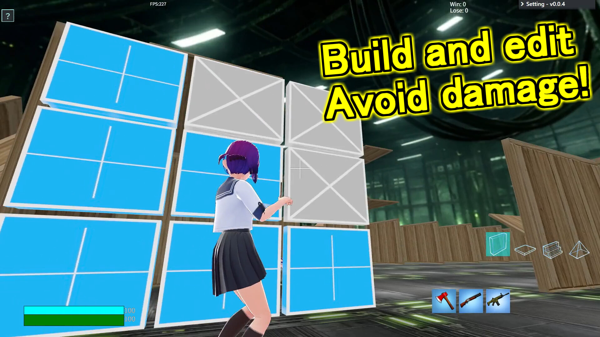 Girlsnite is a fast-paced anime-style TPS where you build walls, floors, and other structures in real time. Fight intense 1v1 battles, outplay CPU opponents, and customize your experience with VRM characters in this lightweight single-player building combat game.