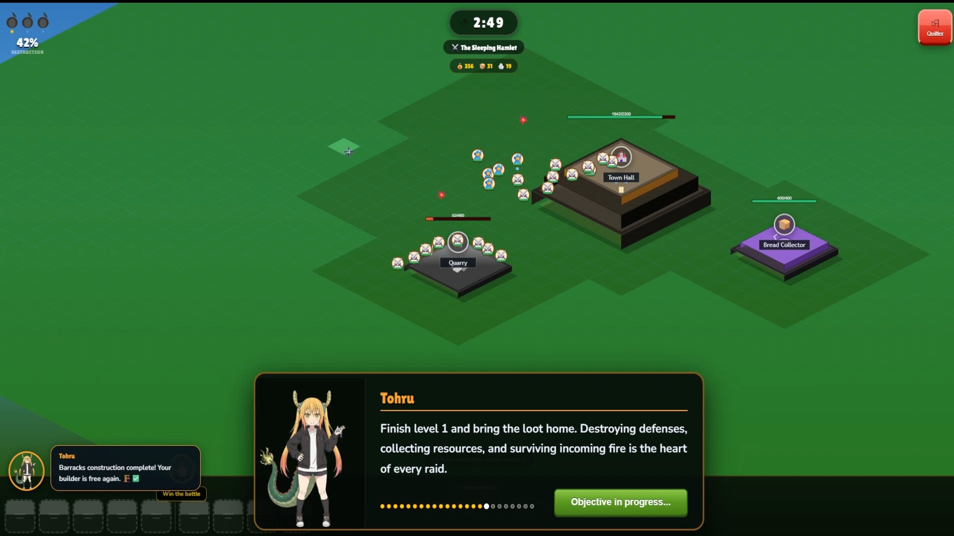 Tohru acts as your lead advisor: she alerts you when your builders are idle, when a construction finishes, or when your army camp is full.