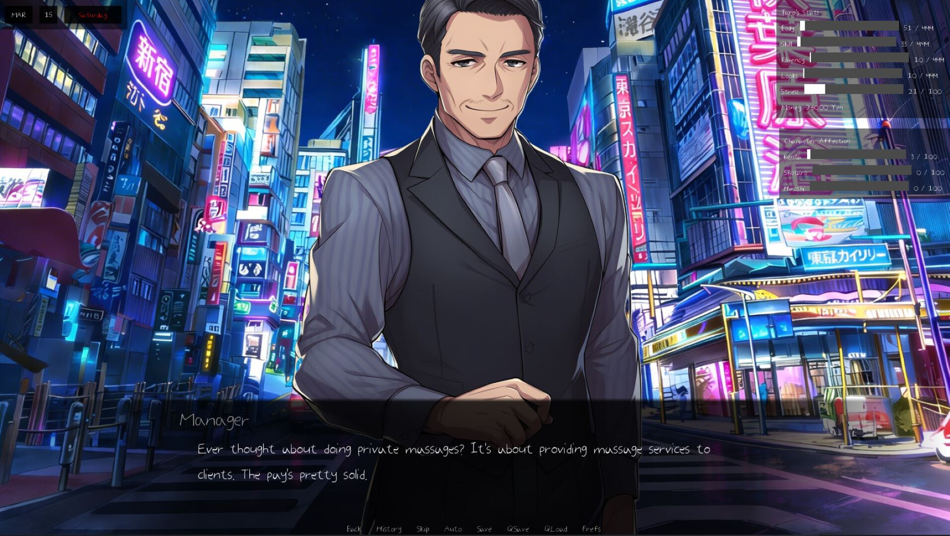 Work at a high-end private massage parlor or a gay karaoke bar, offering increasingly intimate services to wealthy clients. The pay is excellent — but rumors spread fast, and your love interests might not approve.