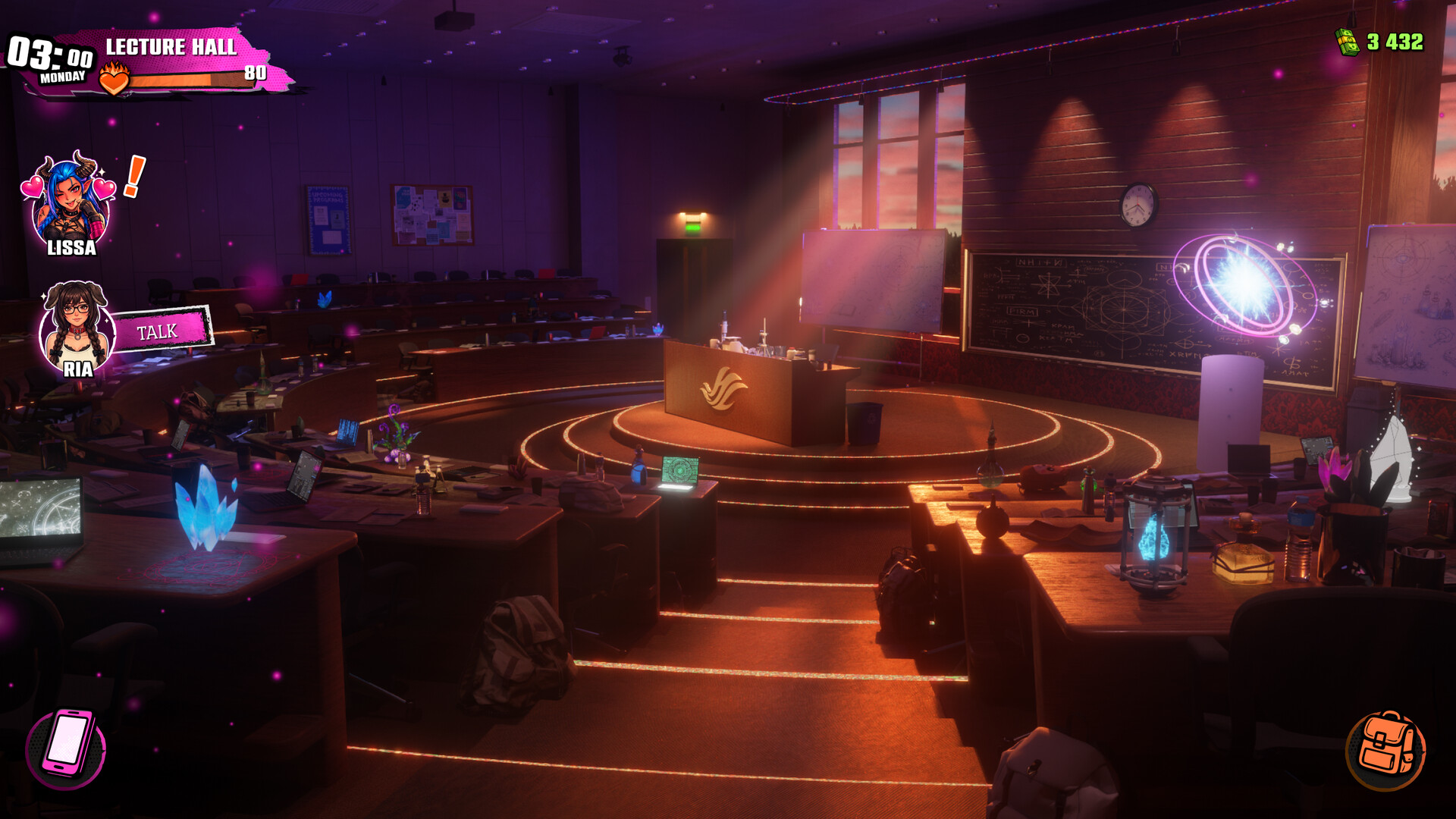 Plan your day, explore the campus, pick your targets, and decide how to spend your time. No strict path — only your strategy.