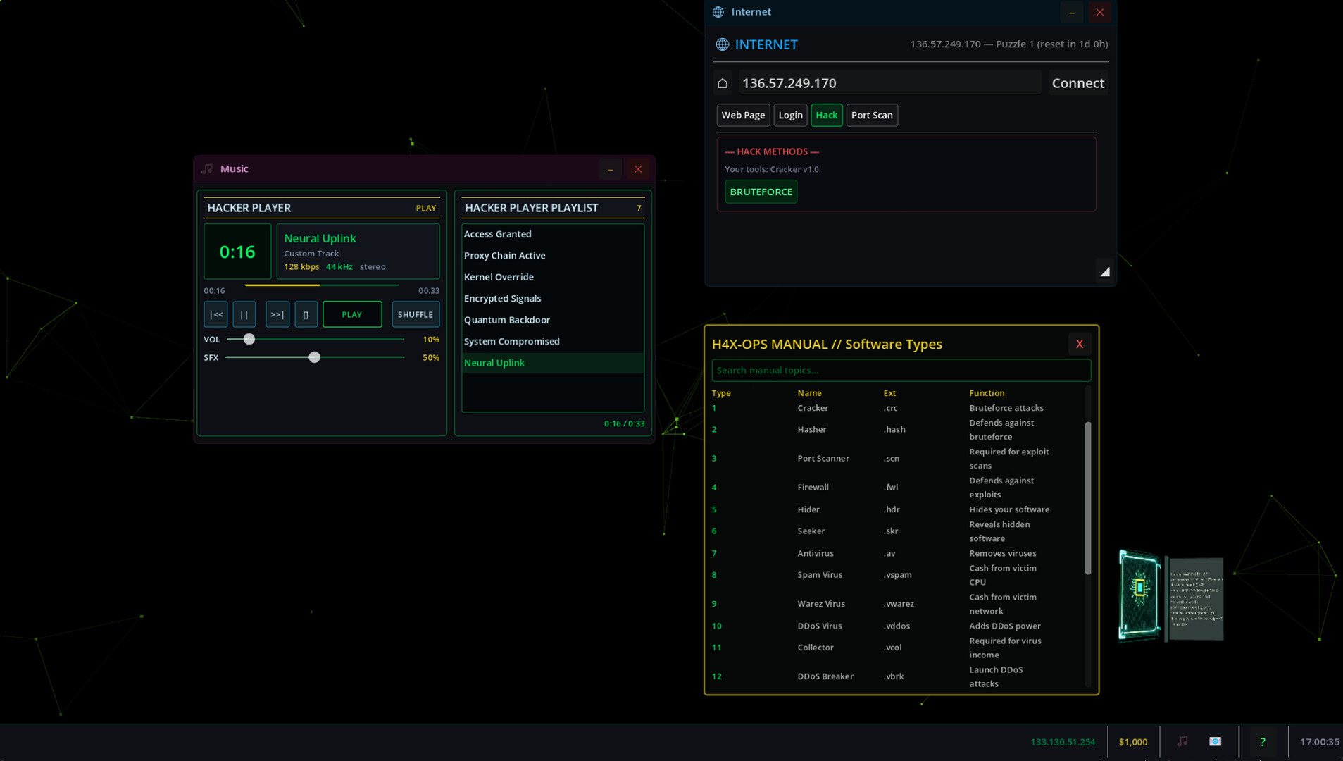 Deploy viruses on compromised servers for passive income. Monitor your botnet through the Virus Manager. Upgrade your CPU, RAM, and network hardware. Mine Bitcoin. Accept contracts from the Mission Board. Climb the rankings.