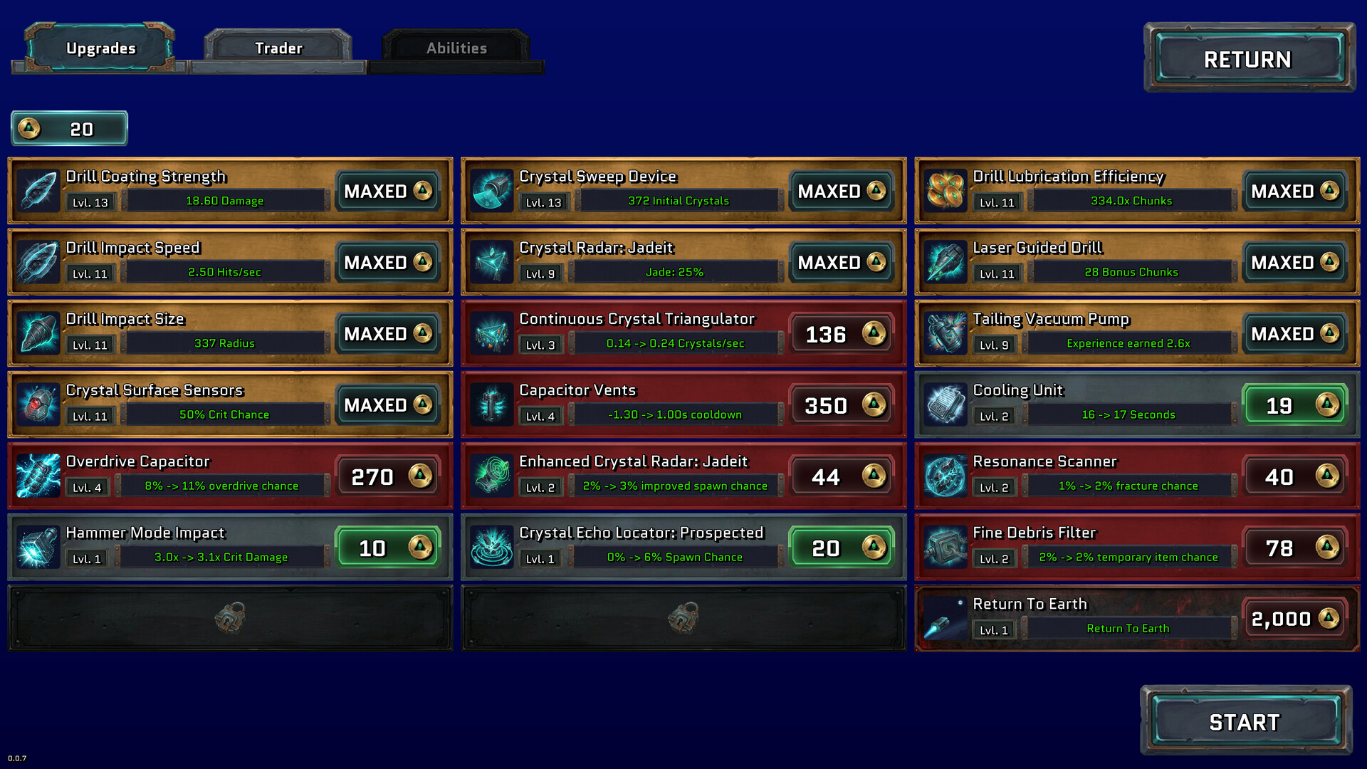 • Main Upgrades - Power, frequency, radius, crit chance, crystal spawning, session duration, and more