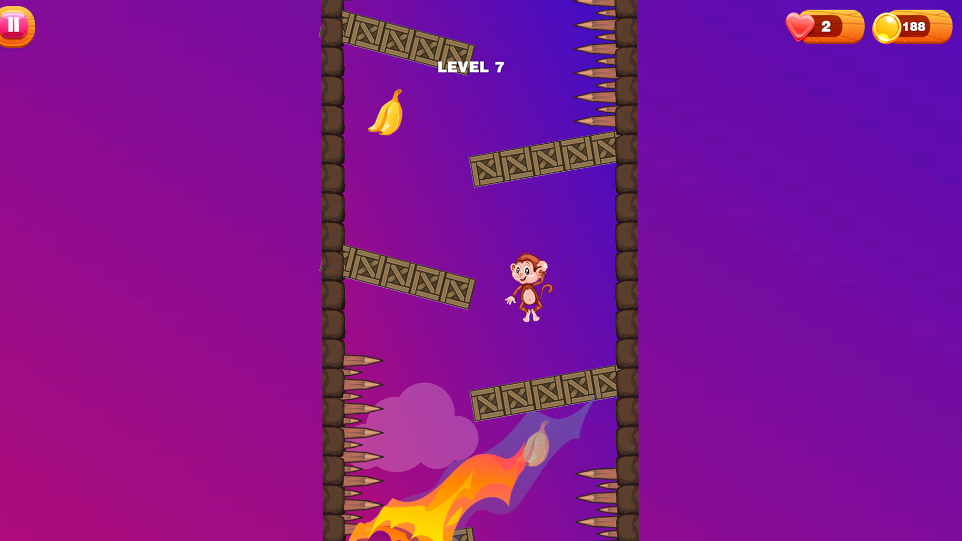 Jump down, collect bananas, and survive as long as possible in this fast-paced 2D casual game.