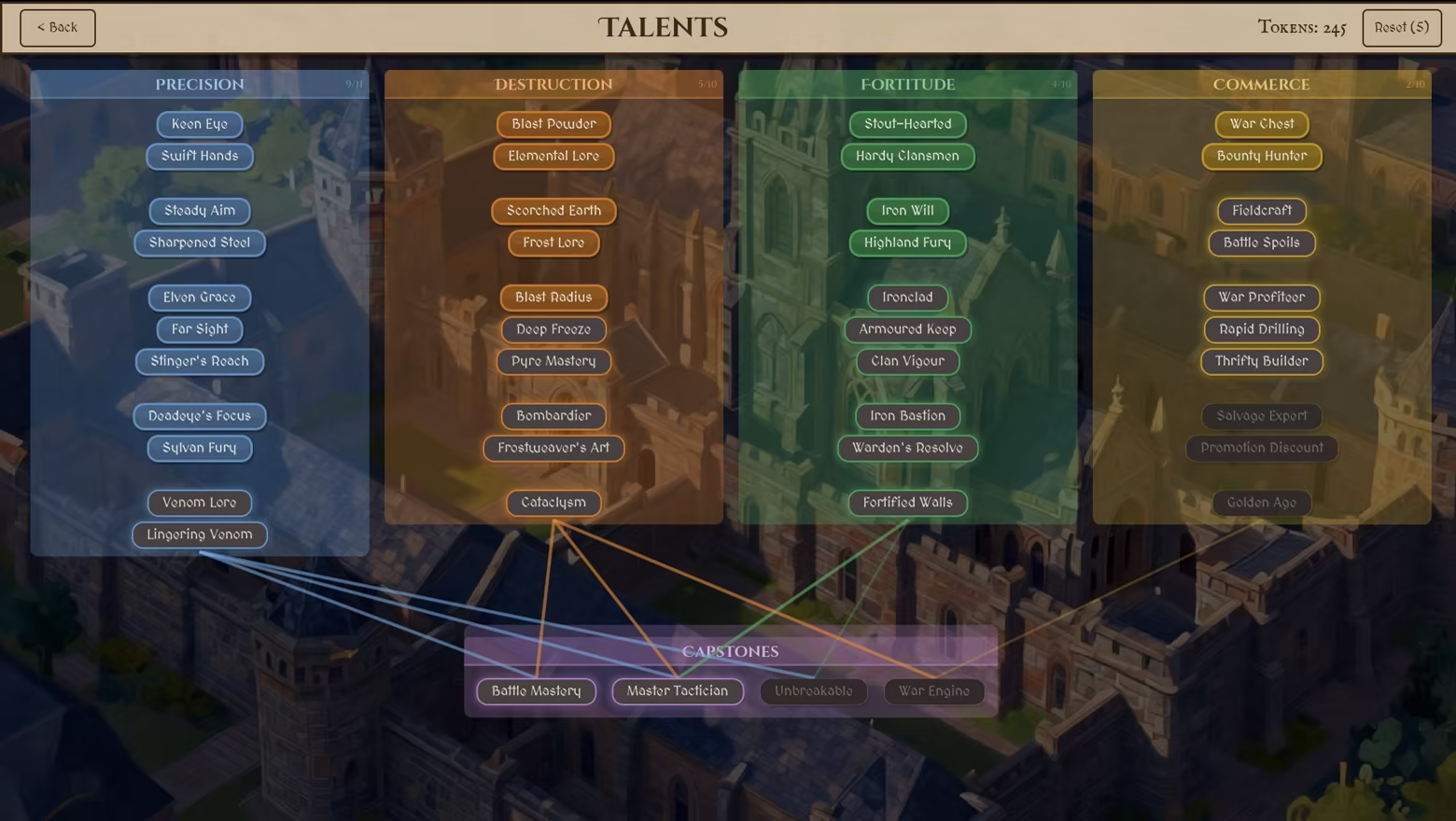 • Invest in 29 talents across 6 tiers — permanent bonuses to damage, range, speed, economy, and affliction resistance