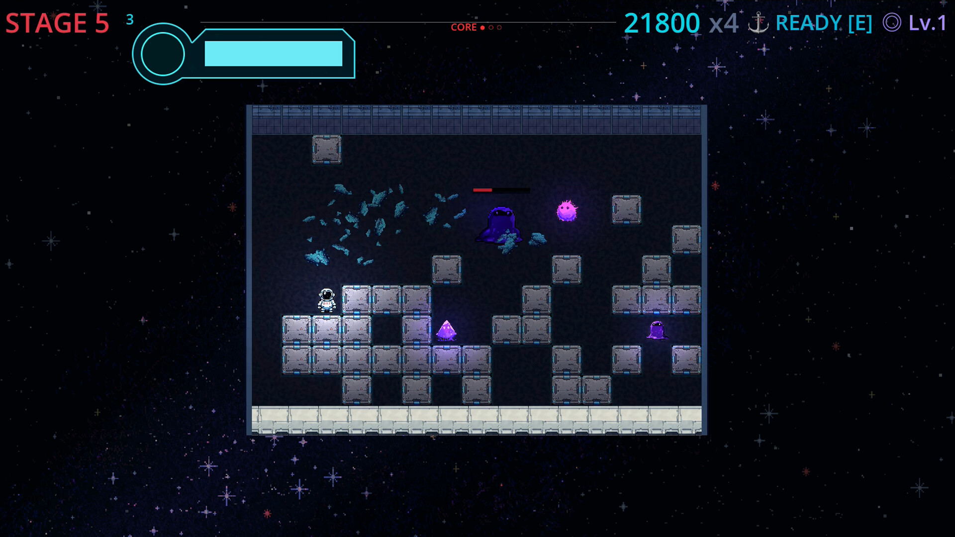 There are no weapons. Your only tools are the cargo blocks scattered across the grid — push them into enemies, chain reactions, and use the zero-gravity drift to clear the field before they close in.