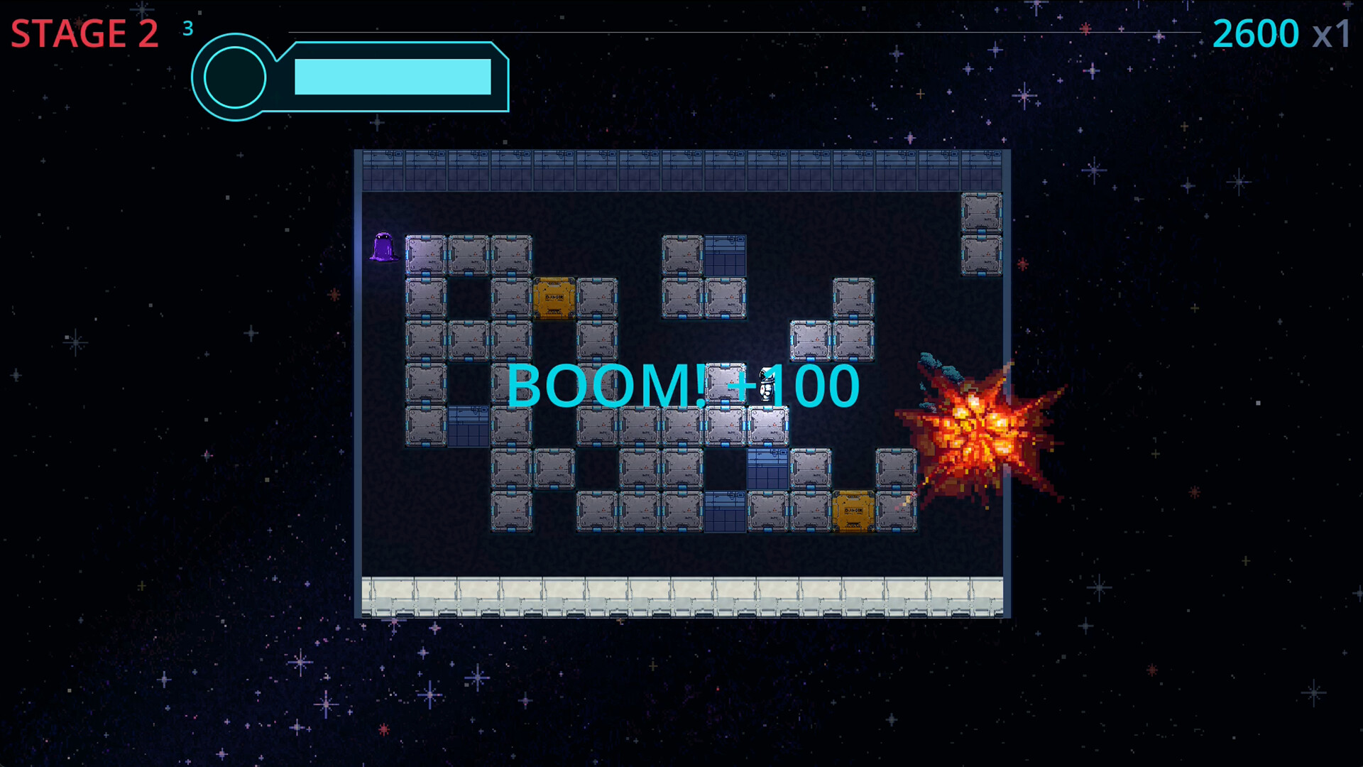 There are no weapons. Your only tools are the cargo blocks scattered across the grid — push them into enemies, chain reactions, and use the zero-gravity drift to clear the field before they close in.