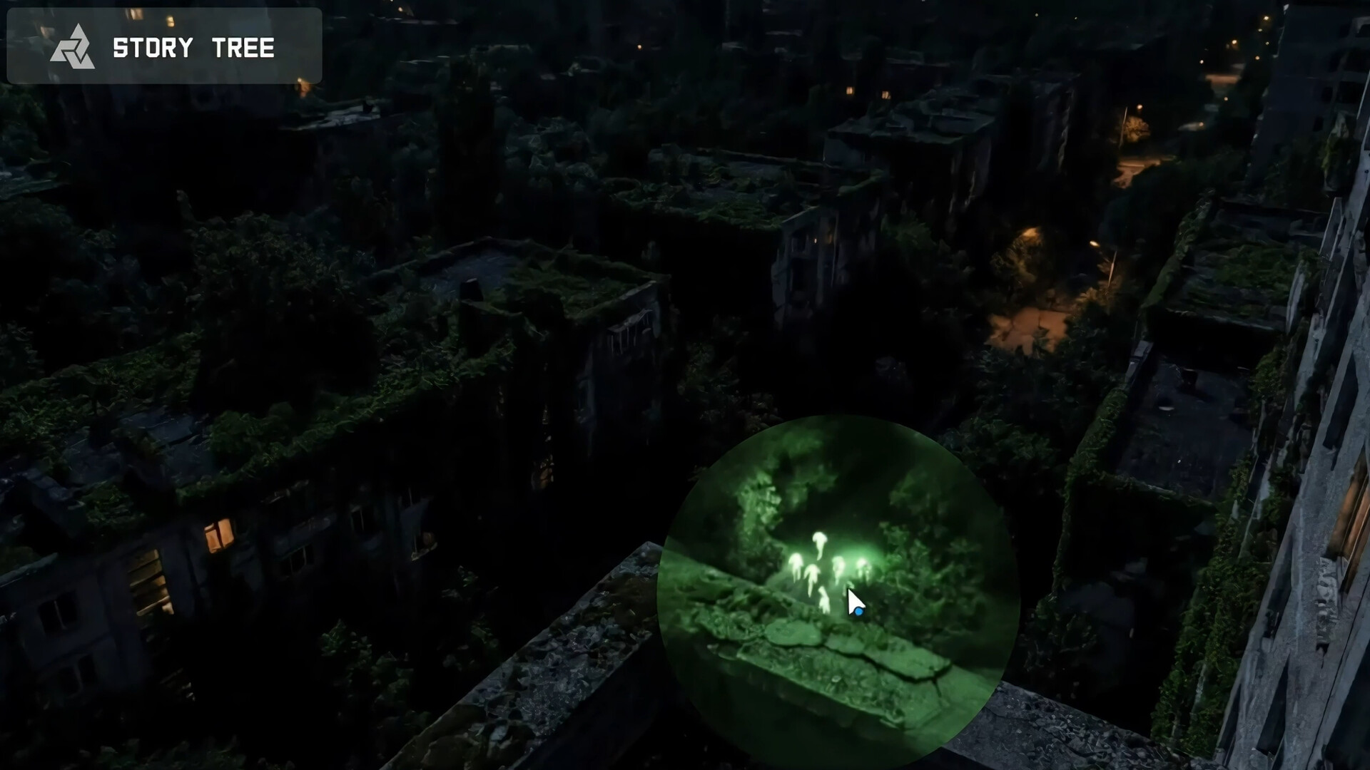 Dark Exploration & Reconnaissance Use tools like night vision devices to scan ruined environments and detect hidden threats. Decide whether to fight, hide, or slip away unnoticed.