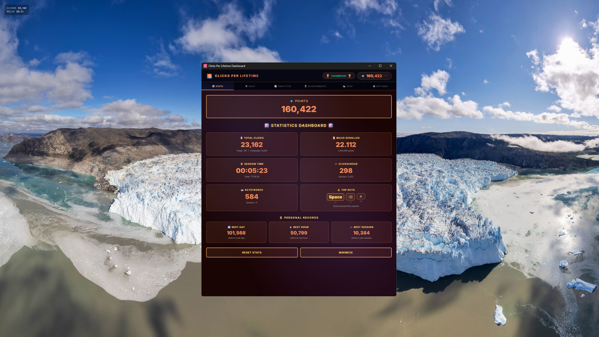 Install and launch Clicks Per Lifetime. It runs quietly in the background, tracking your mouse and keyboard activity system-wide. Check back anytime to see your stats, complete challenges, and climb toward new achievements.