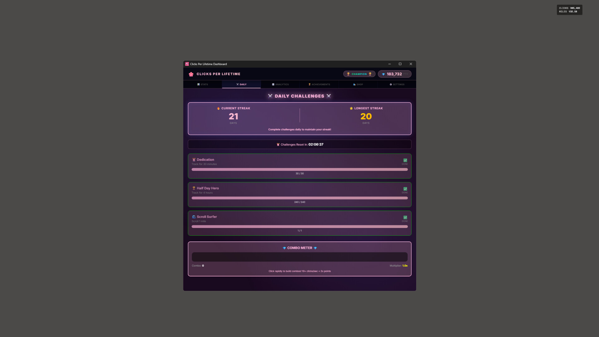 How many times have you clicked today? This year? In your entire life? Track every click, keystroke, and mile scrolled system-wide. Earn points, unlock achievements, and complete daily challenges. Now you can finally know your number.