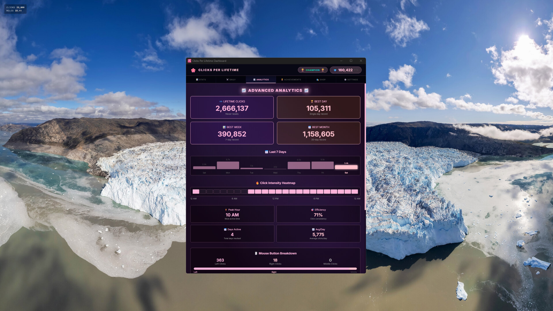 Clicks Per Lifetime is a passive activity tracker that runs in the background while you use your computer. Every mouse click, scroll, and keystroke is recorded, building a picture of your digital life over time.