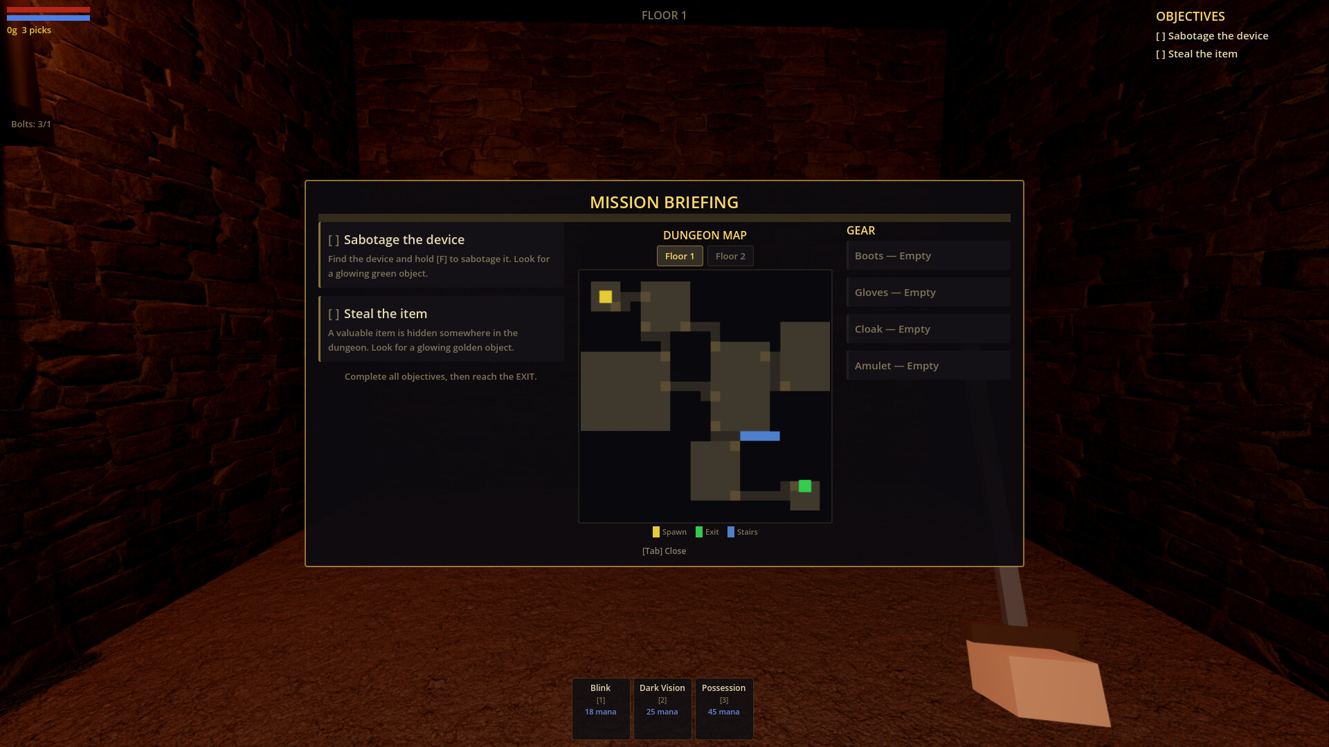 A first person stealth game. Explore procedurally generated dungeons, complete contracts and objectives, and deal with guards.