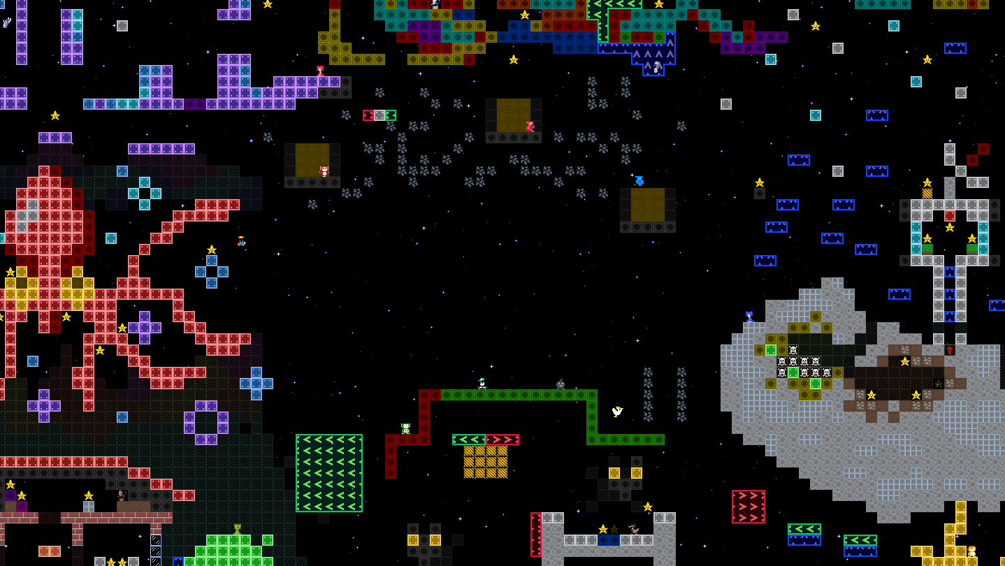 SNAKE - In this co-operative game mode, one player controls a snake of blocks, and everybody else rides the snake! The snake must guide everybody through a hazardous world of crazy gravity and spikeballs to collect all of the stars in the level, but be careful, as the snake gets faster and harder to control as you make progress!