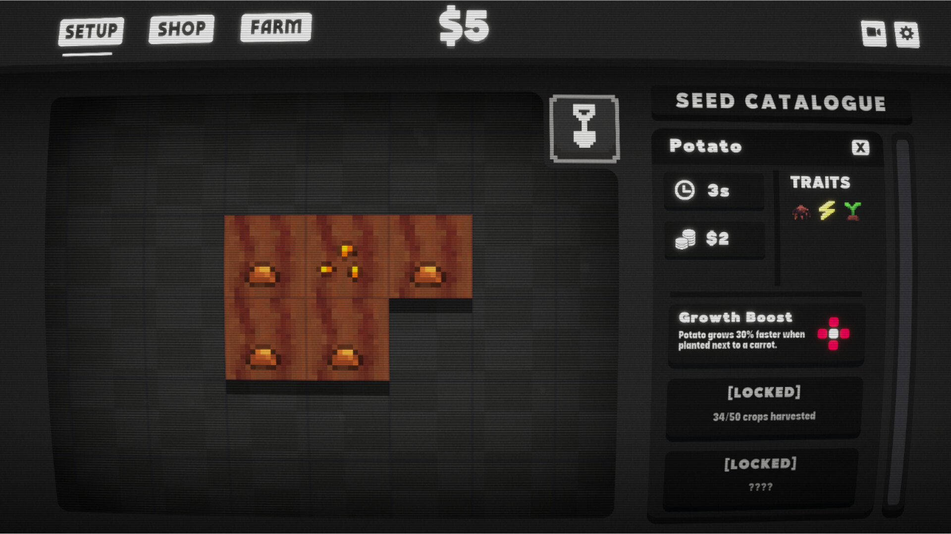 Your goal is to increase your profit by optimizing your farm layout, where crop placement matters due to various abilities and synergies. Use that profit to unlock new crops which bring even more powerful interactions and meaningful decisions. Experiment with different layouts to see which one brings you the most money.