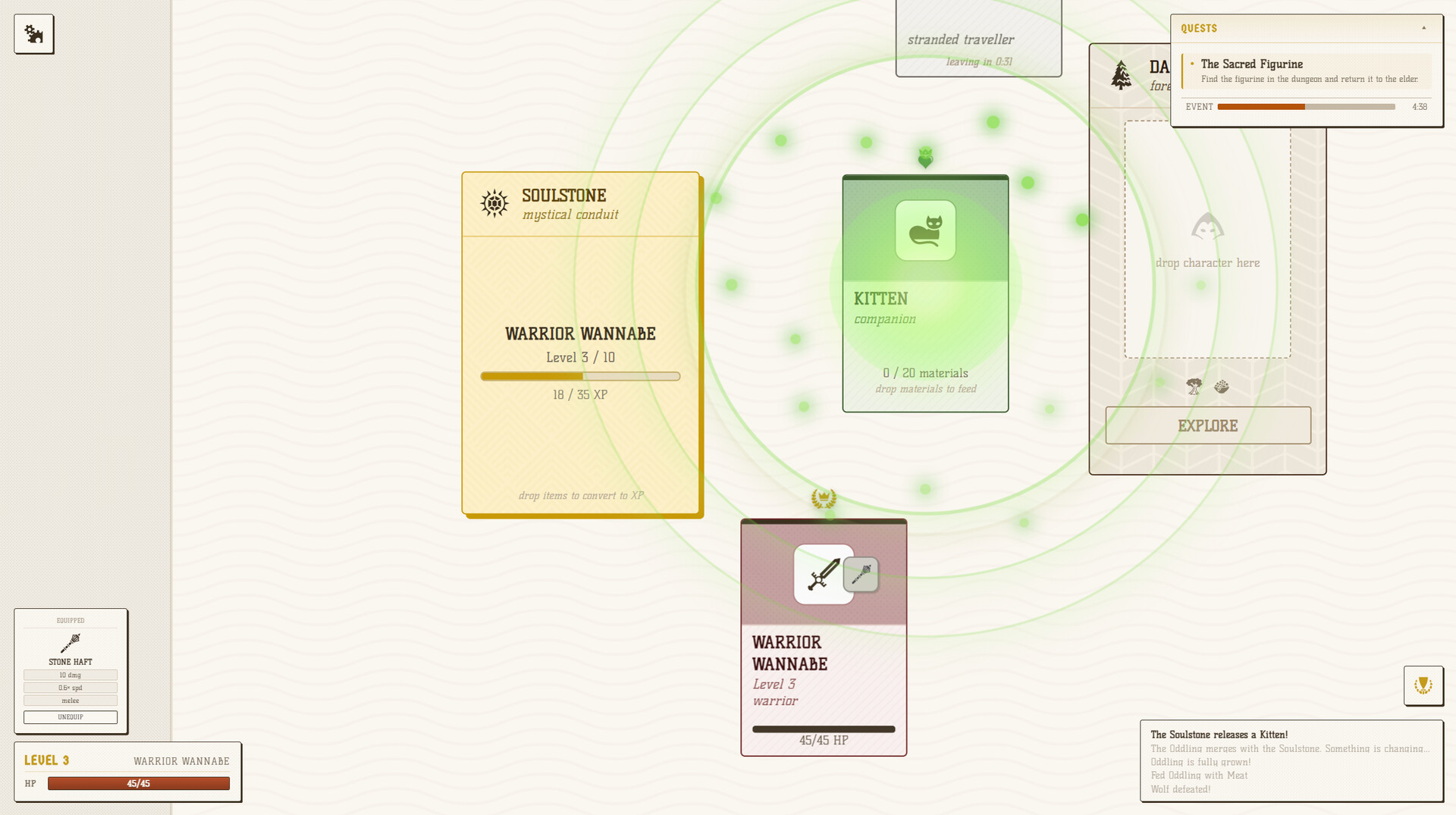 Masadaki idle kart RPG'si. Kartları birbirinin üzerine sürükleyerek kelimenin tam anlamıyla her şeyi yap. 200'den fazla silah tarifi (sadece ~40'ı saklamaya değer), 140 evcil hayvan evrimi, 12 prestij sınıfı. Yine de hayat bulmuş bir planlama aracı gibi hissettiriyor.