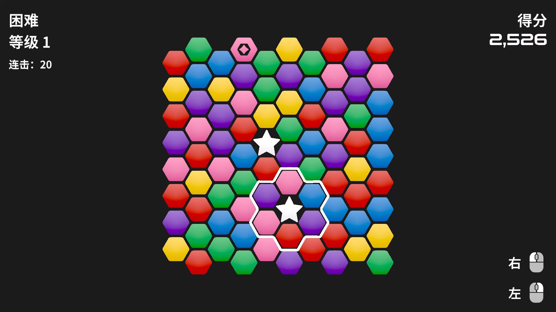 旋转六边形方块组合,创造匹配,触发强力连锁反应,不断提升你的分数。上手简单,但精通困难。一次失误就可能让你满盘皆输。