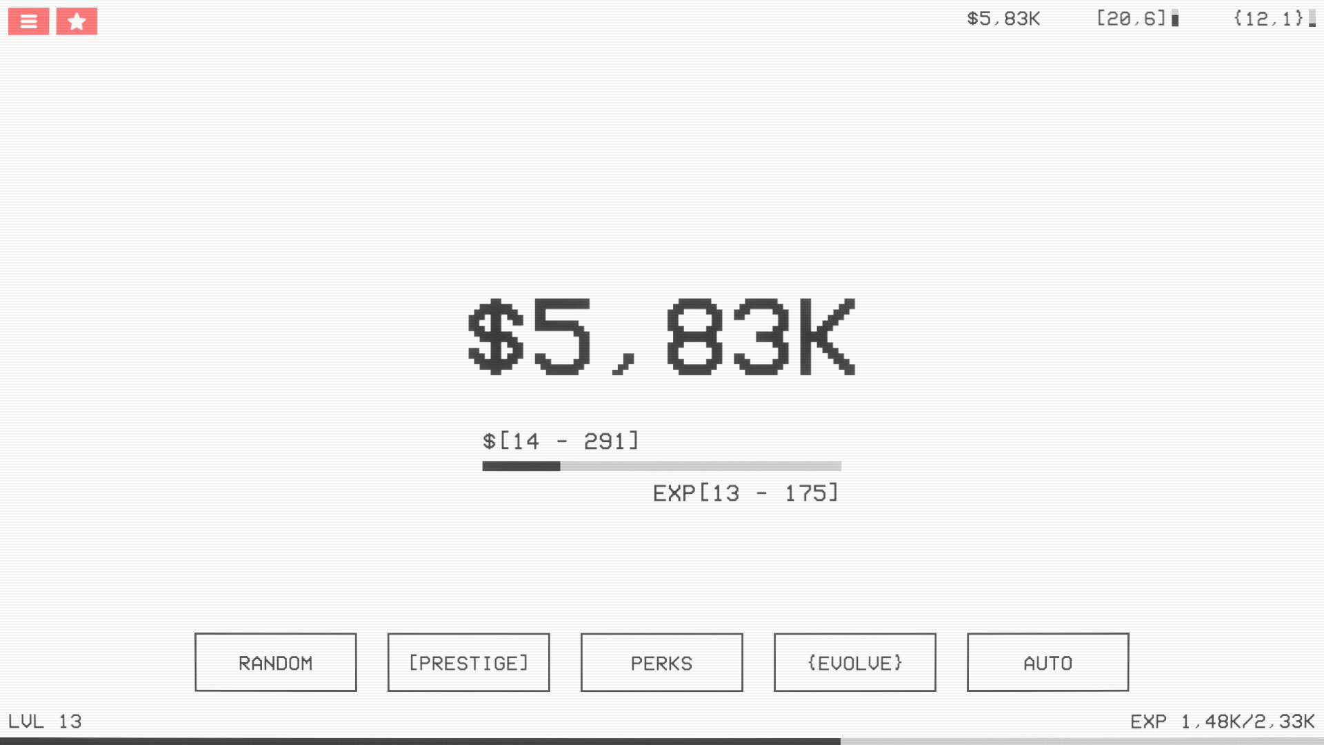 Click or wait for an idle income. Purchase upgrades with random income values to maximize your profit. Invest into permanent prestige and evolve upgrades. Automate your purchases and level up infinitely. Use the reset function to increase your extra currencies farming process. Collect all the Steam achievements and reach the highest level!
