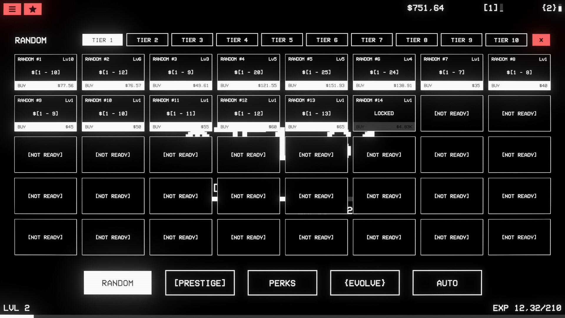 Click or wait for an idle income. Purchase upgrades with random income values to maximize your profit. Invest into permanent prestige and evolve upgrades. Automate your purchases and level up infinitely. Use the reset function to increase your extra currencies farming process. Collect all the Steam achievements and reach the highest level!