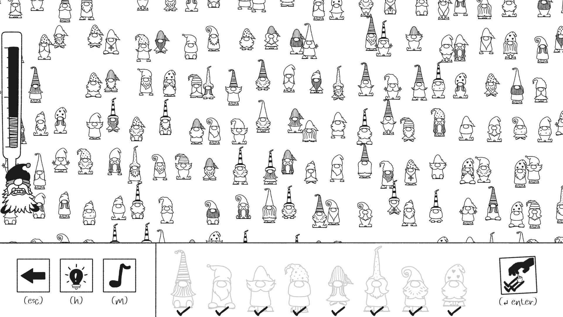 Et simpelt spil i genren skjulte objekter med håndtegnet grafik. Find de nisser, der bliver efterspurgt, i en stor menneskemængde. I hver runde ændrer deres udseende og placering sig, hvilket gør spillet genspilbart igen og igen.