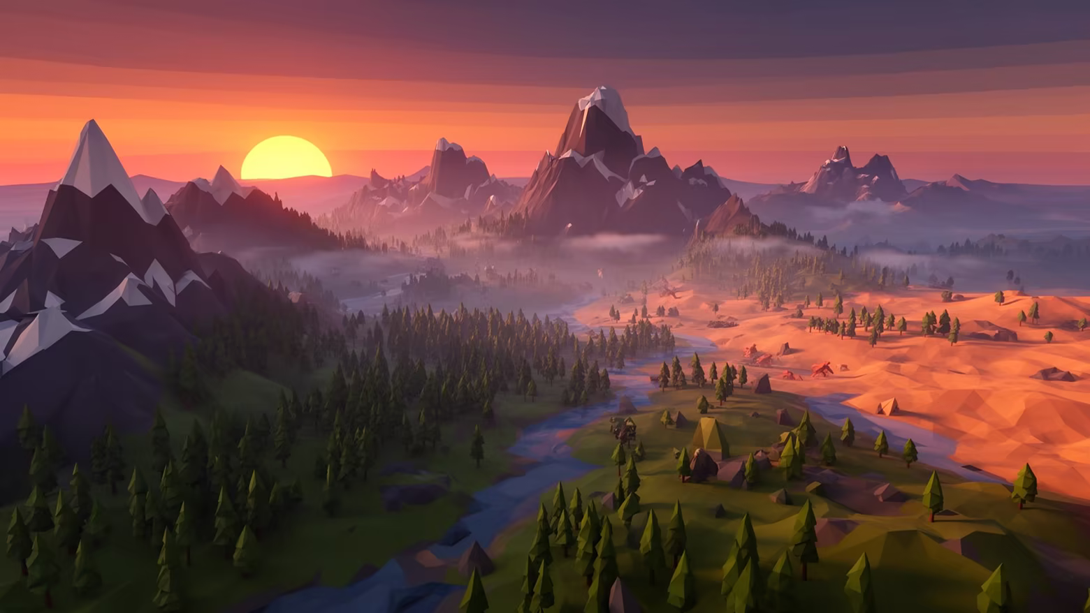 • Low-Poly Aesthetic — Bold geometry and dramatic lighting on any hardware