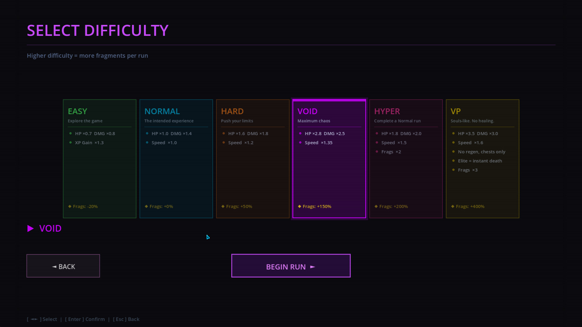 De Facile à VOID PROTOCOL — un mode souls-like sans soin passif, des élites qui tuent en un coup et des récompenses en fragments triplées. Gagnez des Badges VP sur chaque vaisseau.