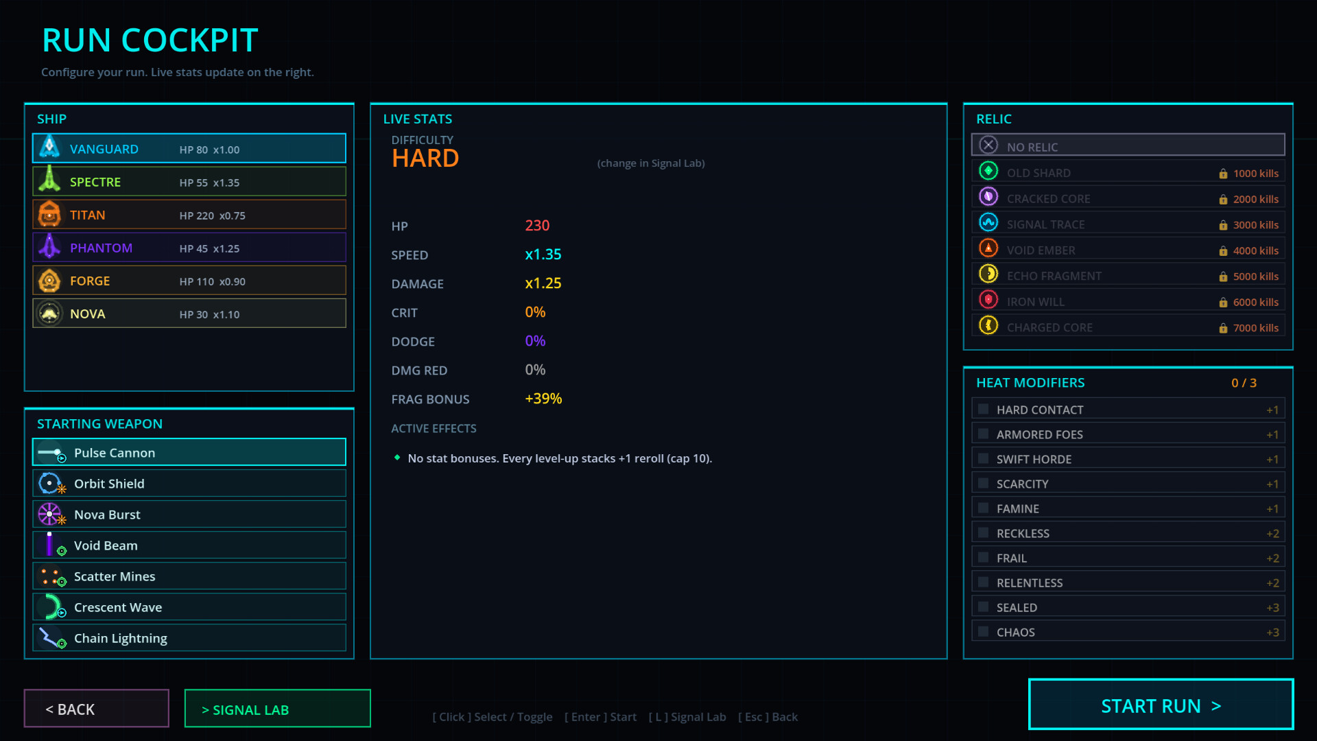 Dalla modalità Facile a VOID PROTOCOL souls-like (cura passiva disabilitata — le casse curano ancora, doppia ricompensa in frammenti, triplo danno nemico). Aggiungi la modalità Endless o 9 modificatori Challenge per ancora più punizione. Guadagna Badge VP su ogni nave.