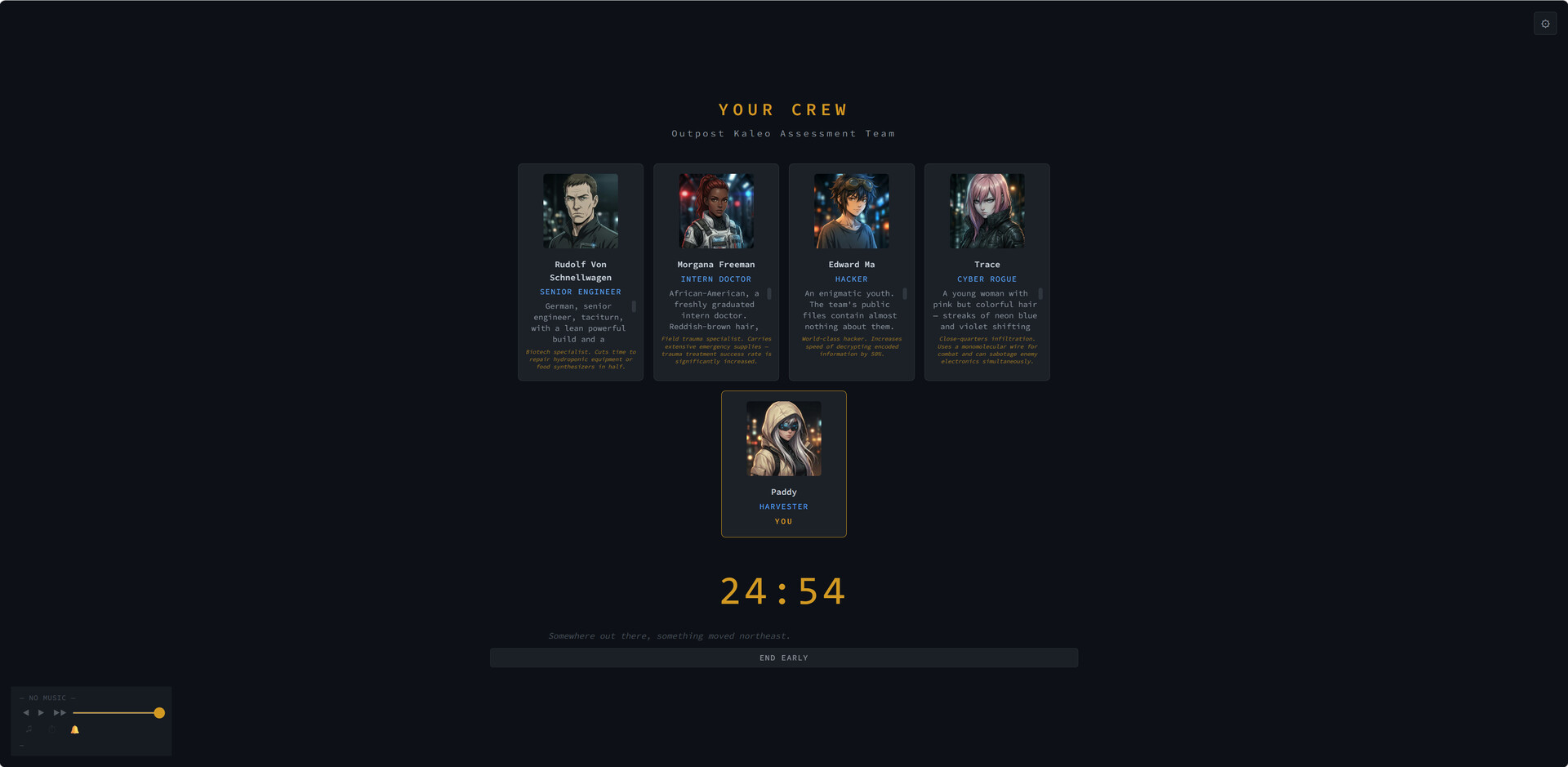 When the timer ends, you come back to a new page of the story waiting for you. The world has moved. Your crew has done things. Someone said something you need to respond to. You read the chapter, make a few decisions from the cards on screen, type any free-form actions you want into the action box, and start another Pomodoro.